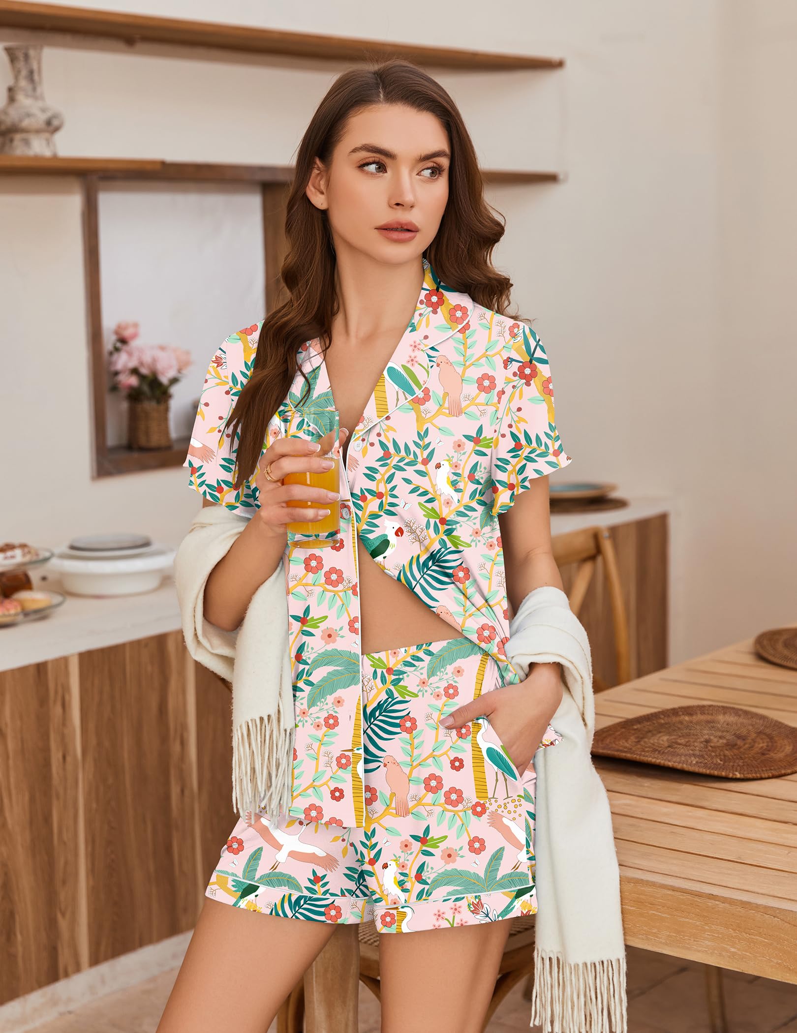 【Thoughtful Design】This women's pajama set features a short sleeve button-down top that falls at the hip, with a stylish notch collar. The shorts come with an adjustable drawstring elastic waistband for a custom fit, plus two convenient side pockets for small essentials.