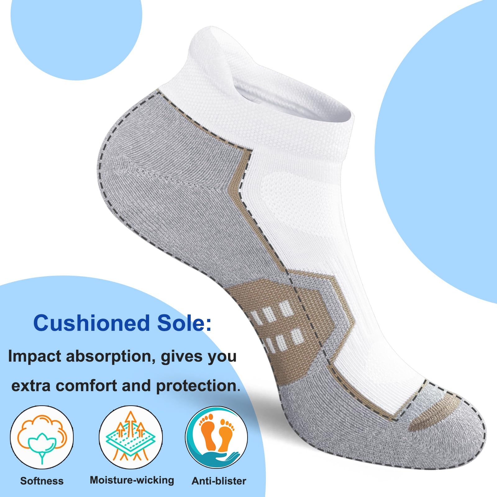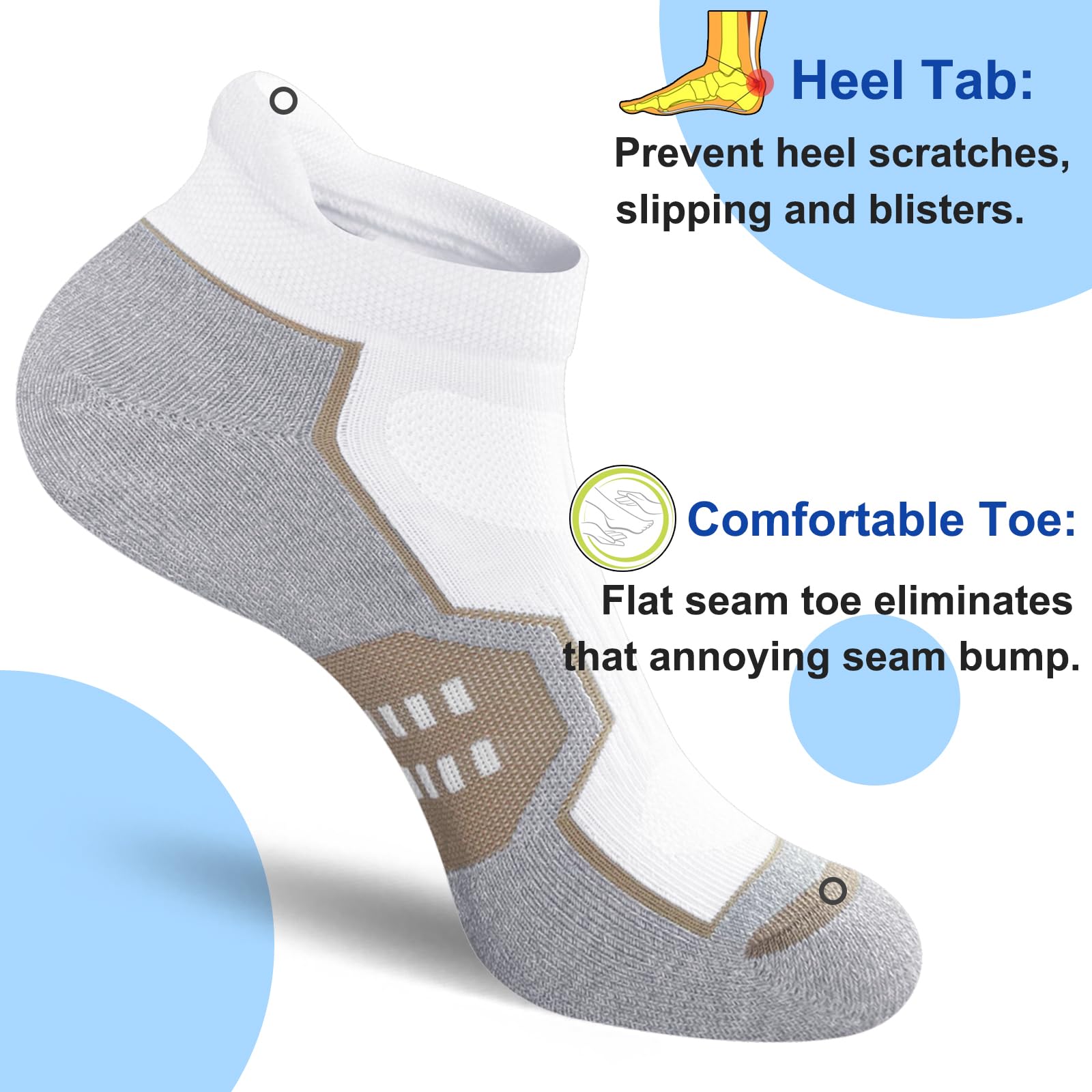 【Heel Tab & Flat Seam Toe】These womens socks with padded tab that prevent socks from slipping off and protect your ankles from blisters. Flat seam toe eliminates that annoying seam bump. Perfect for running, sports, hiking, climbing, cycling and everyday wear.
