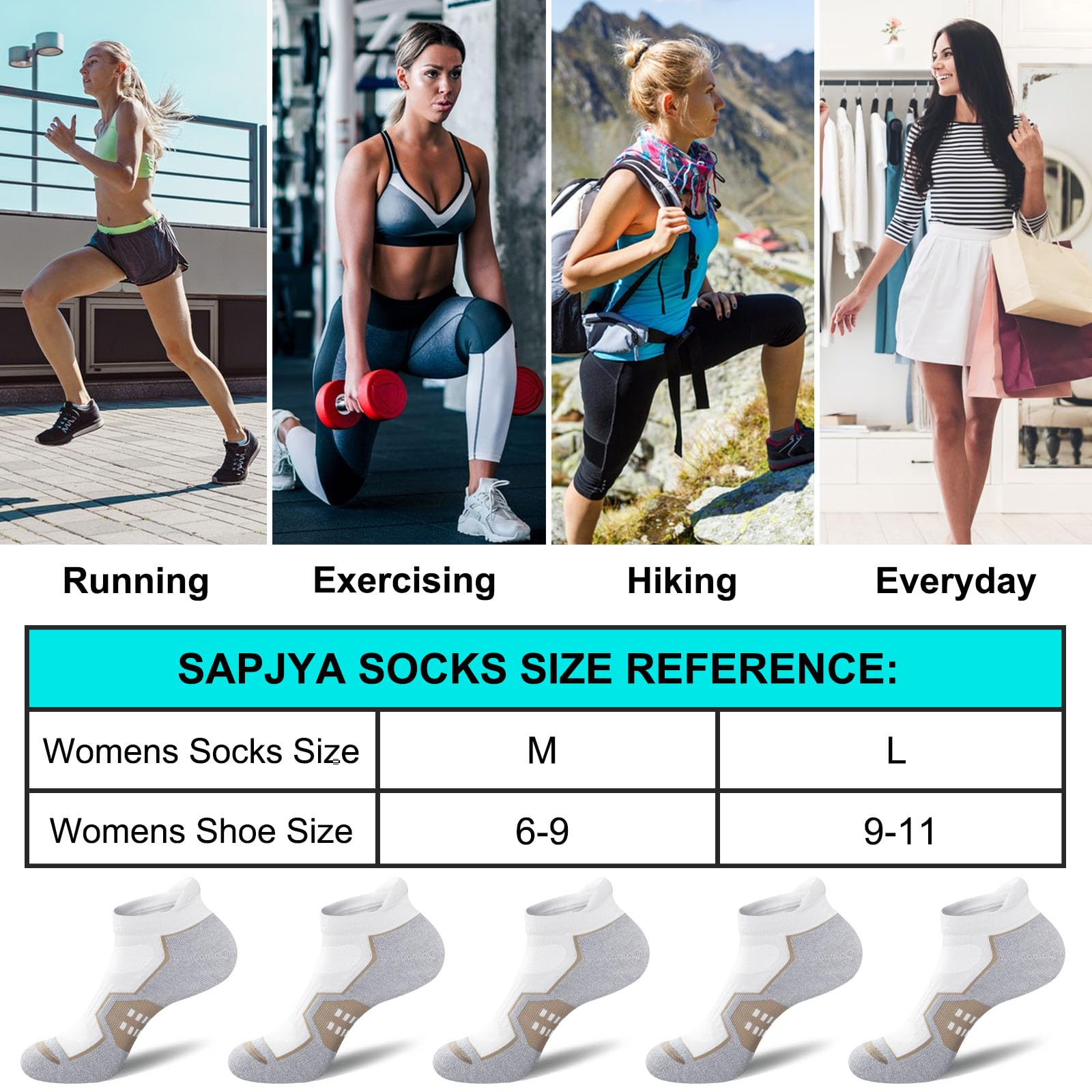 Description Womens Cushioned Ankle Athletic Running Socks 5 Pairs PERFORMANCE FEATURE Mesh Breathable: Mesh fabric offers ventilation, moisture-wicking, keeping your feet cool and dry. Arch Support: Arch Support helps to reduce foot fatigue and keep socks in place. Padded Heel Tab: Protects ankle against blisters caused by rubbing against the footwear. Comfort Cushioned: The cushioned sole delivers comfort and shock absorption. Reinforced heels and toes: The toe and heel are reinforced in high-wear areas for durability and comfort. SPECIFICATION Package: Includes 5 Pairs Socks. Size: Medium (Womens shoe size 6-9); Large (Womens shoe size 9-11). WASHING INSTRUCTION Machine wash or hand wash. Do not iron, bleach or put socks in hot water or suds for long time.