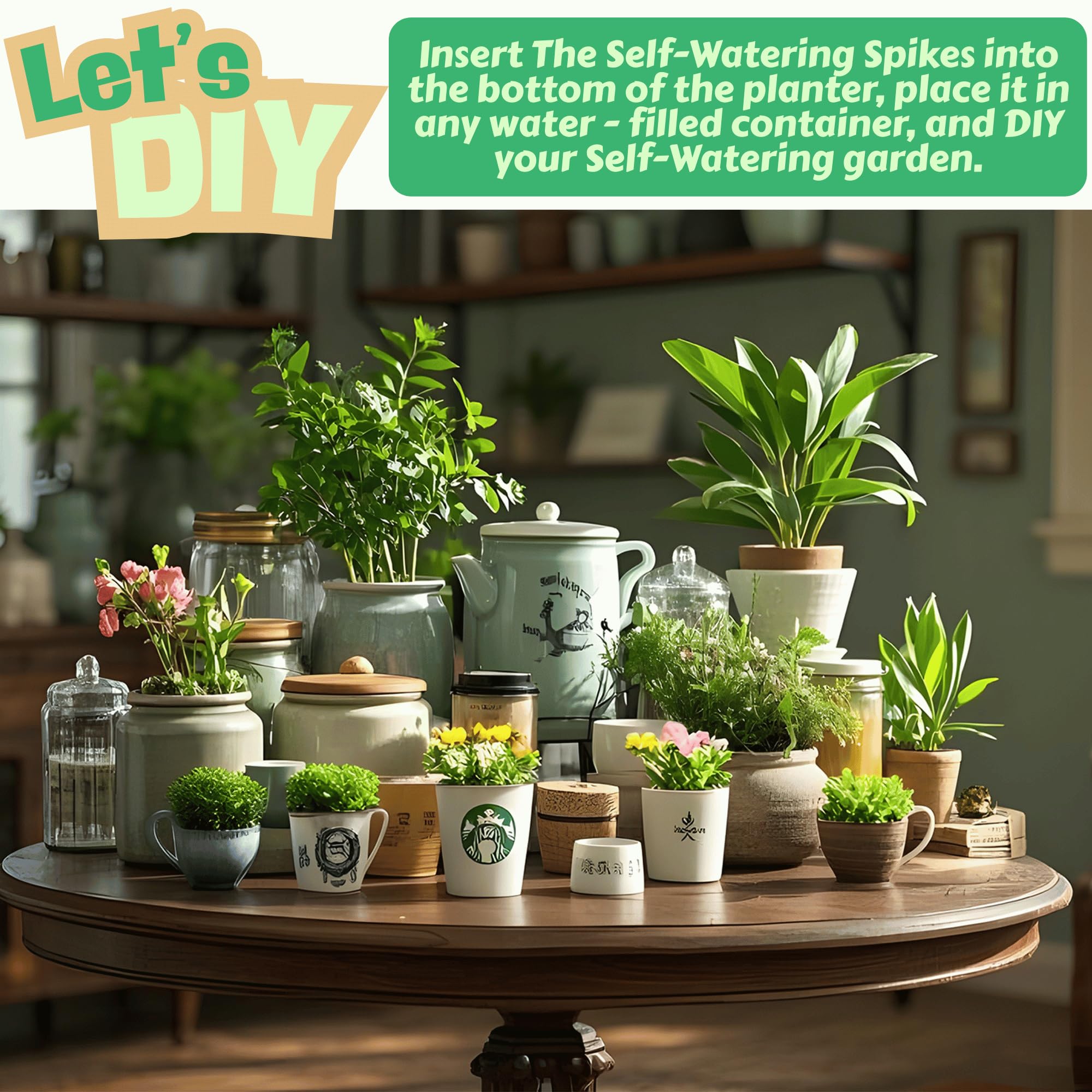 Easy DIY Self-Watering: Transform your indoor plants into self-sufficient greenery by inserting these patented spikes into the bottom of your grower pots. Simply place the pot into any water-holding container to create an efficient self-watering system.