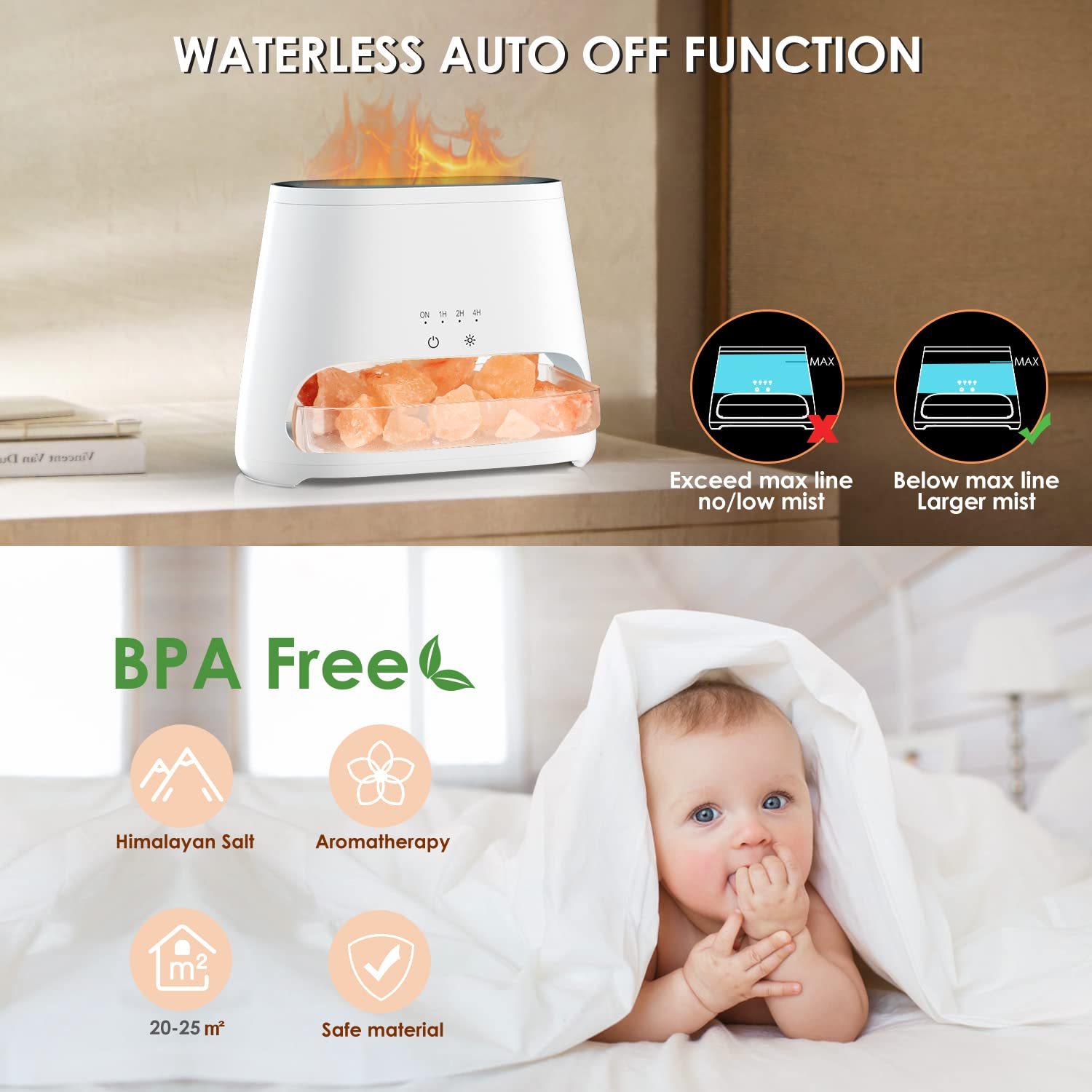 Eye-Catching Simulation Flame Effect - Salt therapy lamp and aromatherapy diffuser with flame is such unique concept and design. The combination of the LED lights and the water vapor from the diffuser creates an ultra-realistic simulation flame effect. In addition, this flame diffuser has 4 timer-setting modes: ON/1H/2H/4H. Less than 20db anti-noise structure ensures a comfortable and warm sleeping environment.