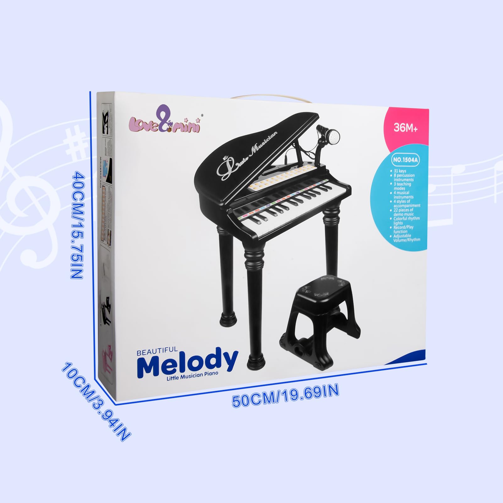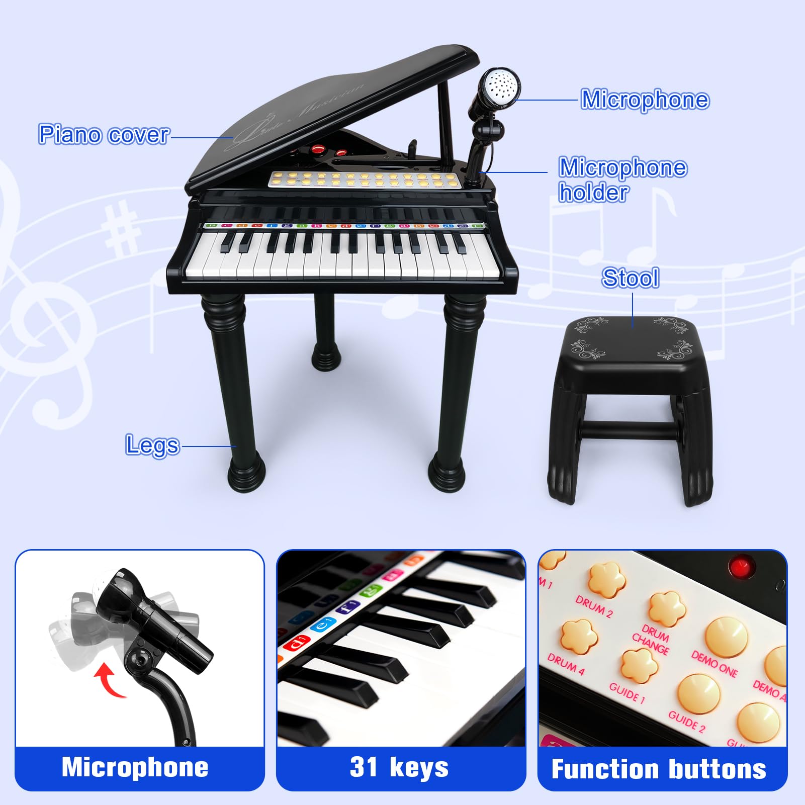 31-KEYS MULTIFUNCTIONAL MUSICAL PIANO TOY FOR AGES 3-5: This baby piano features 31 black and white keys, 22 demo songs, 8 music styles, 8 accompaniment options, 4 percussion effects, 4 instrument tones, a 2-minute power-saving mode, as well as record/playback functions and adjustable volume. These diverse features promise endless fun for your child.