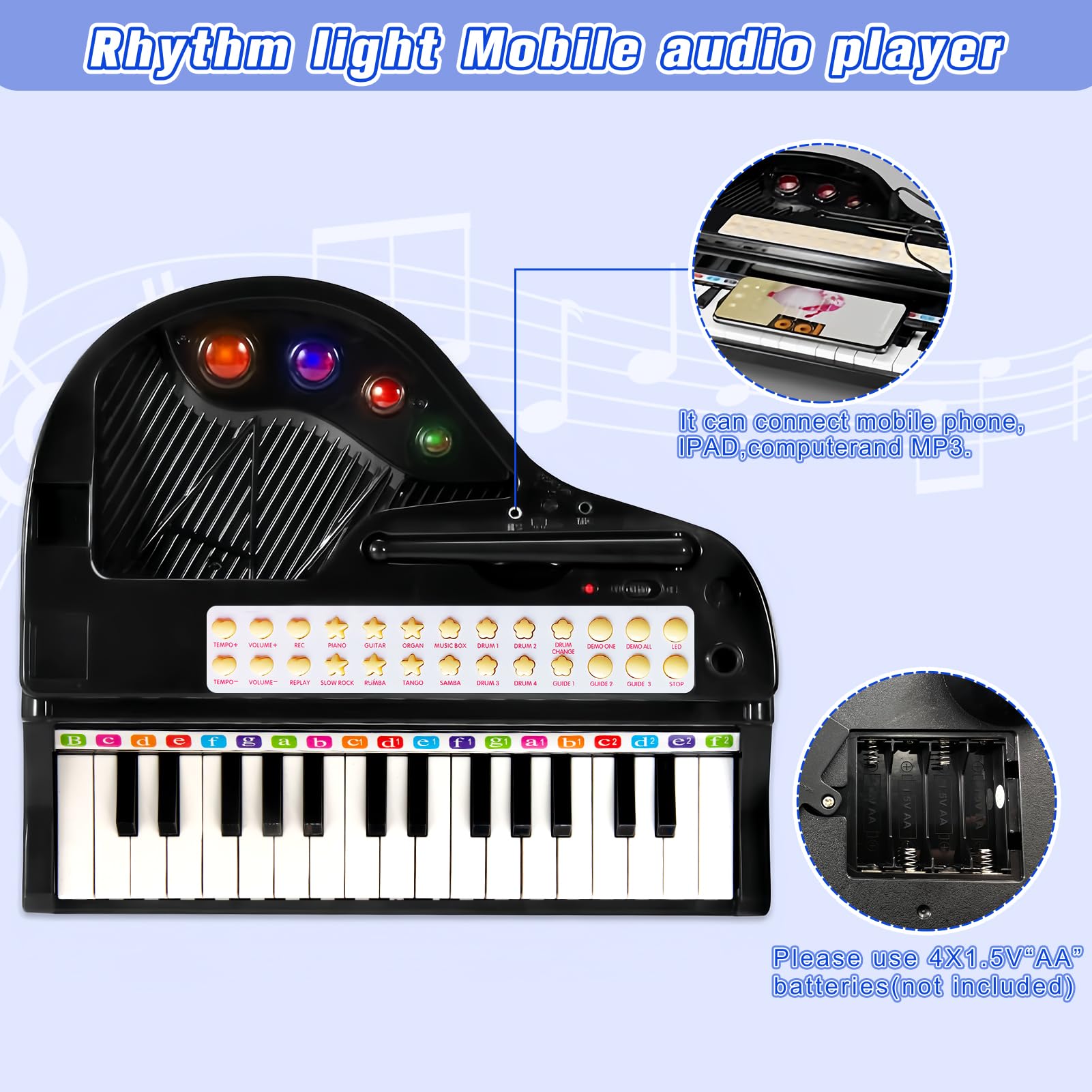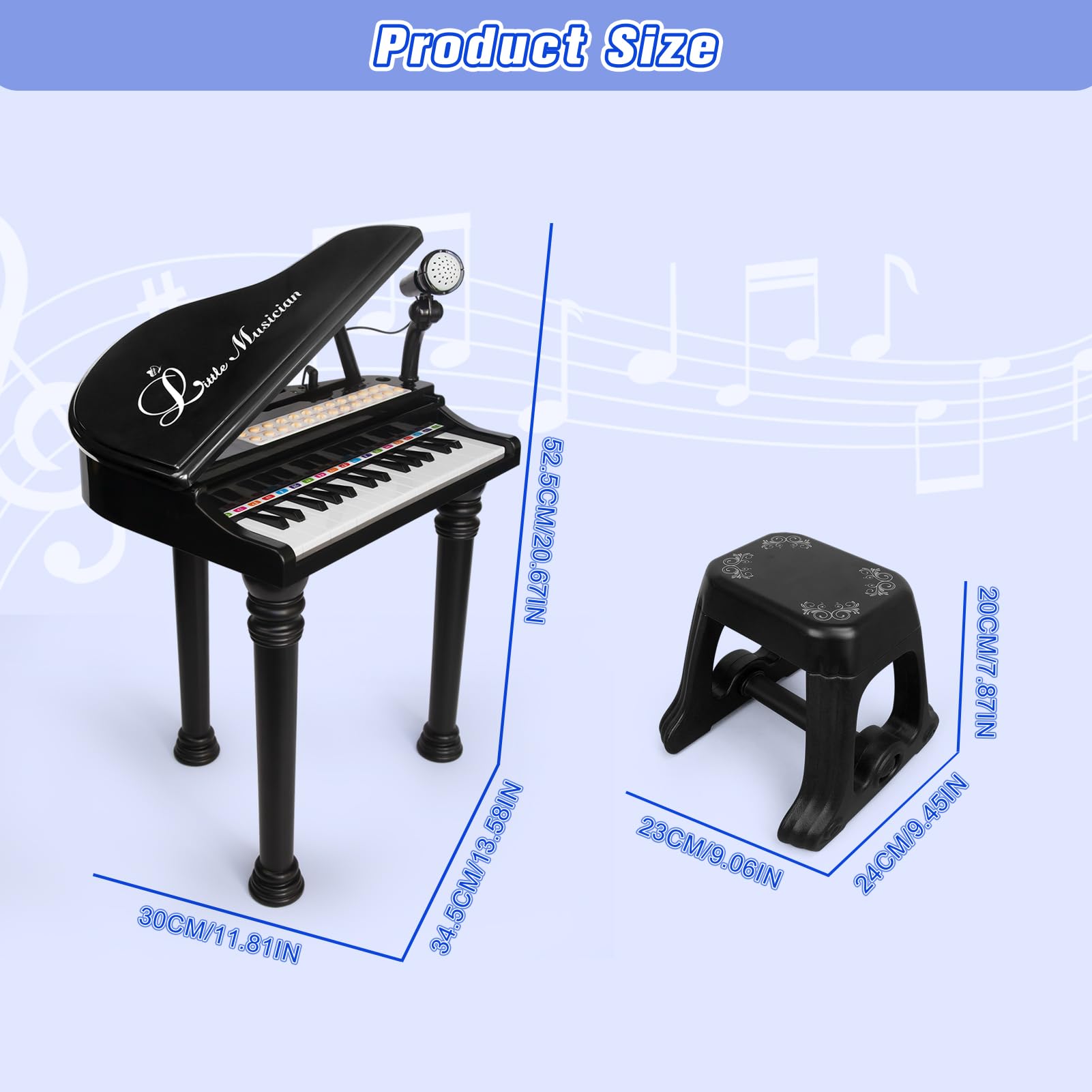 PERFECT GIFT FOR GIRLS BOYS: Give the gift of music! This educational toy helps develop self-confidence, hand-eye coordination, motor skills, memory, imagination, and emotional expression. It's the perfect musical instrument for children aged 3 and up. The toys piano size is about 13.58*11.81*20.67 in inch and powered by 4 AA batteries of 1.5V (not included). Let's start to create our own music.