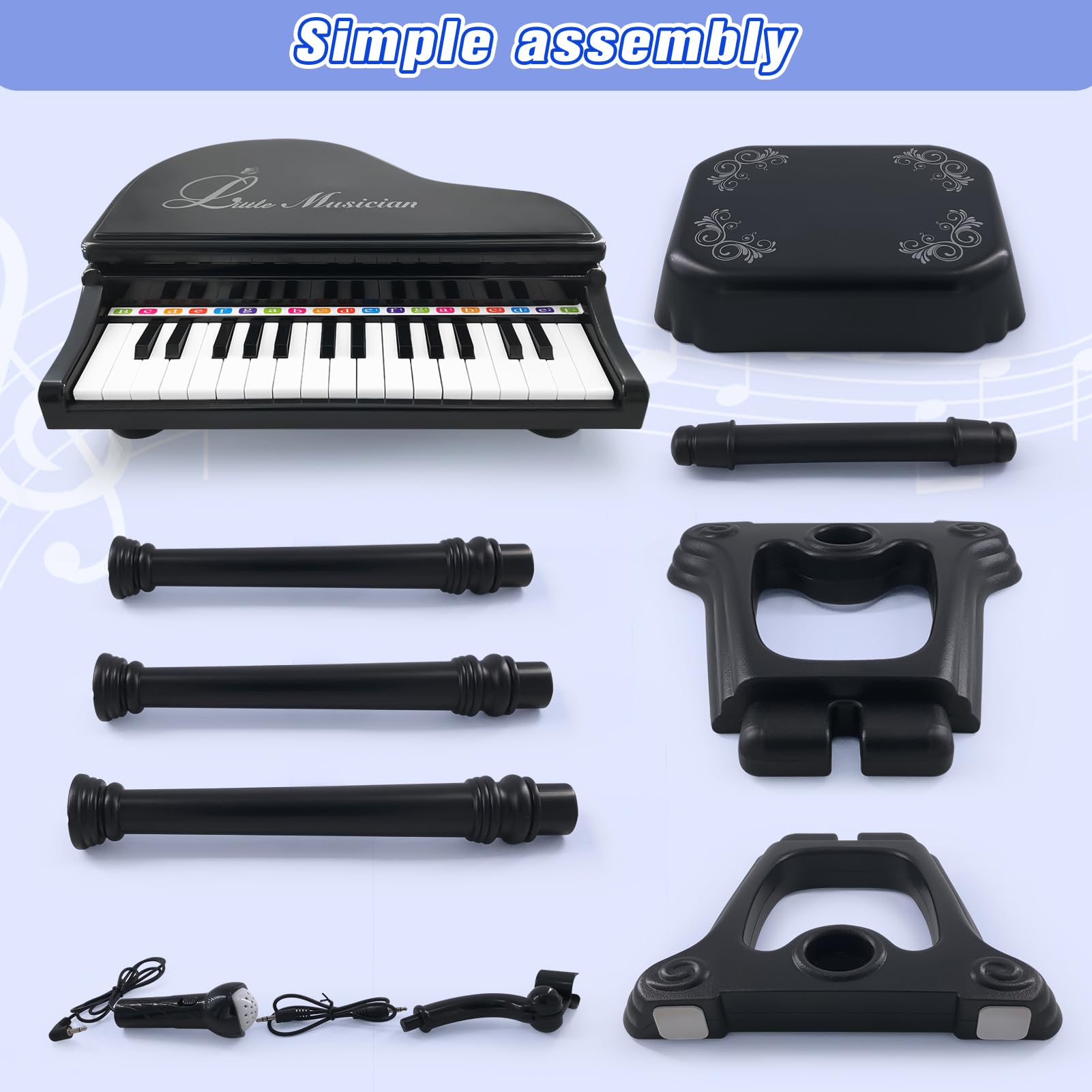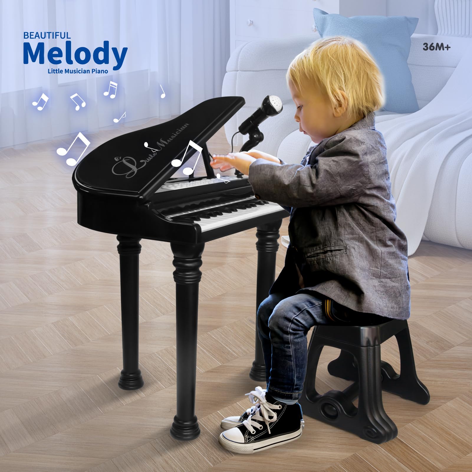 KARAOKE MODE WITH USB CABLE: Equipped with MIC and MP3 interfaces, this piano allows kids to connect to MP3 players, phones, tablets, or computers for added musical fun. It also comes with a stool and an adjustable microphone, so your child can sing while playing!