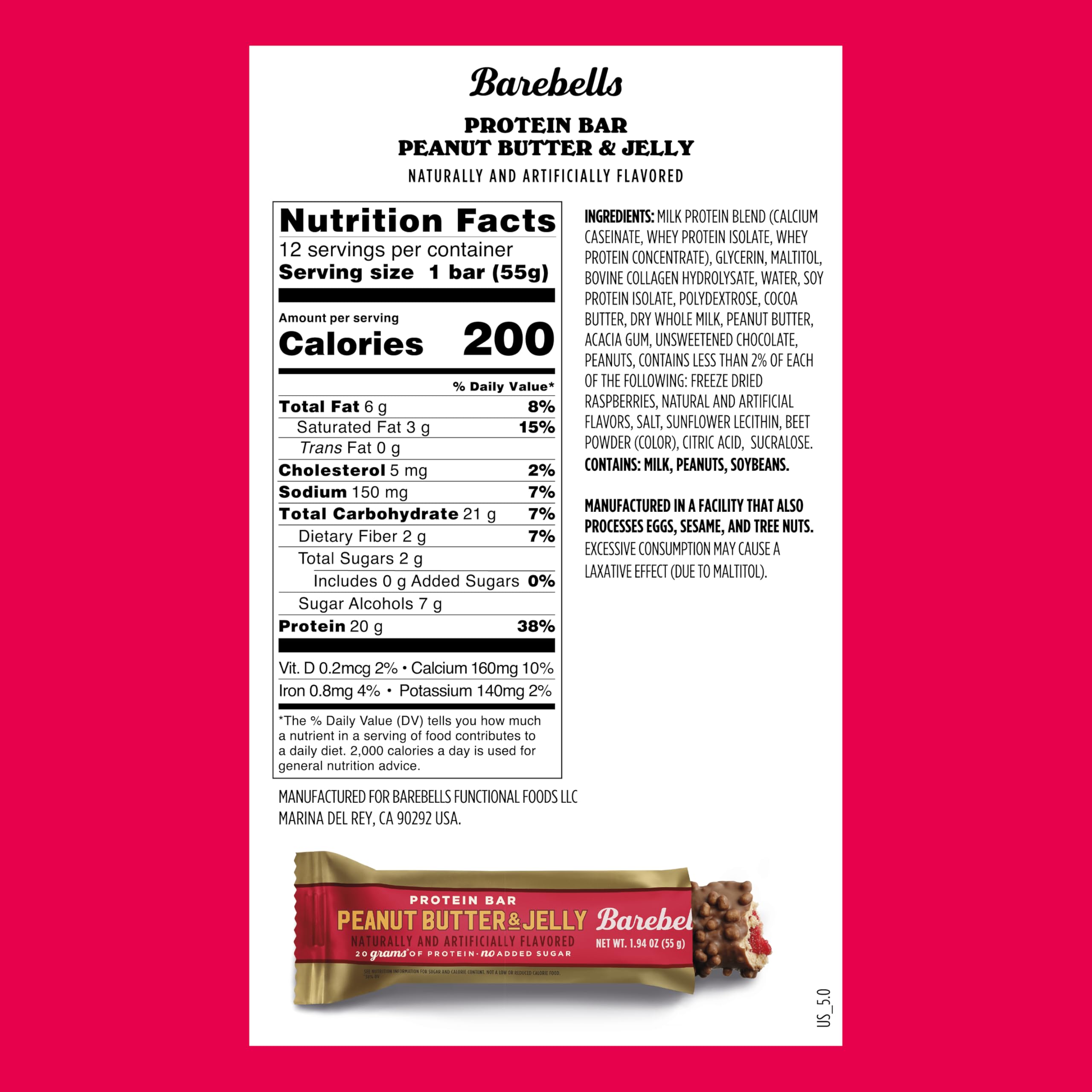 Is your nostalgic obsession peanut butter and jelly? Meet Barebells Peanut Butter & Jelly - which brings together rich peanut butter and a fruity raspberry filling — all wrapped up in a protein bar with 20 grams of protein and no added sugar*. Nostalgic, crave-worthy, and unlike anything you’ve ever tasted in a protein bar. Dreams really do come true. Inspired by the classic PB&J you grew up with, this protein bar is made with real freeze-dried raspberries and delivers 20 grams of protein with no added sugar*. The rich peanut butter coating and fresh berry center create a perfectly balanced flavor that’s unlike anything you’ve tasted in a protein bar. * Not a low or reduced calorie food. See nutrition information for sugar, calorie and saturated fat content.