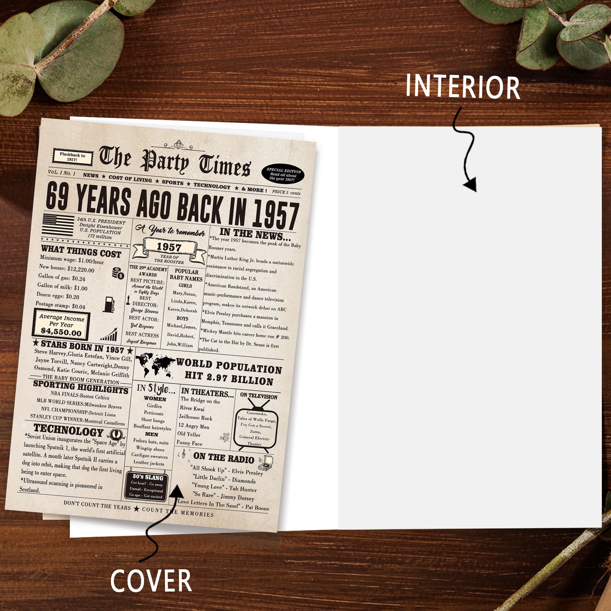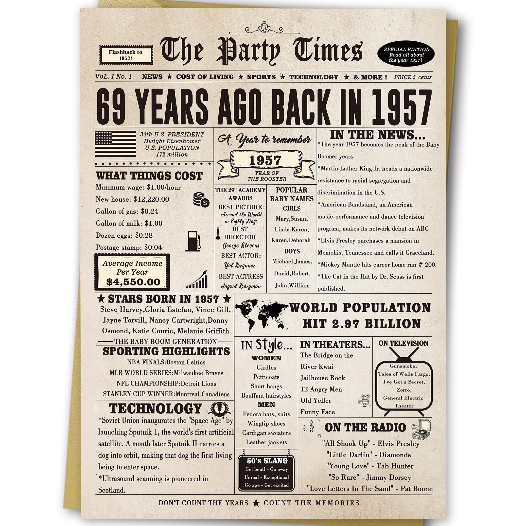 This large 69th birthday card features a vintage newspaper design, showcasing important events, movies and sports events from 69 years ago