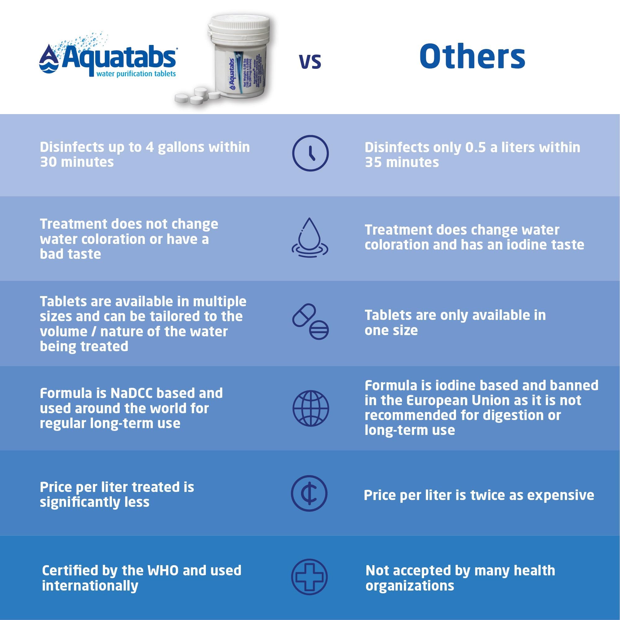 DRINKING WATER, ANYTIME, ANYWHERE - Aquatabs are the world's most popular tablet and the ultimate choice for portable water treatment tablets. Removes 99.9999% of Bacteria, 99.99% of Viruses, and 99.9% of Cysts (Giardia).