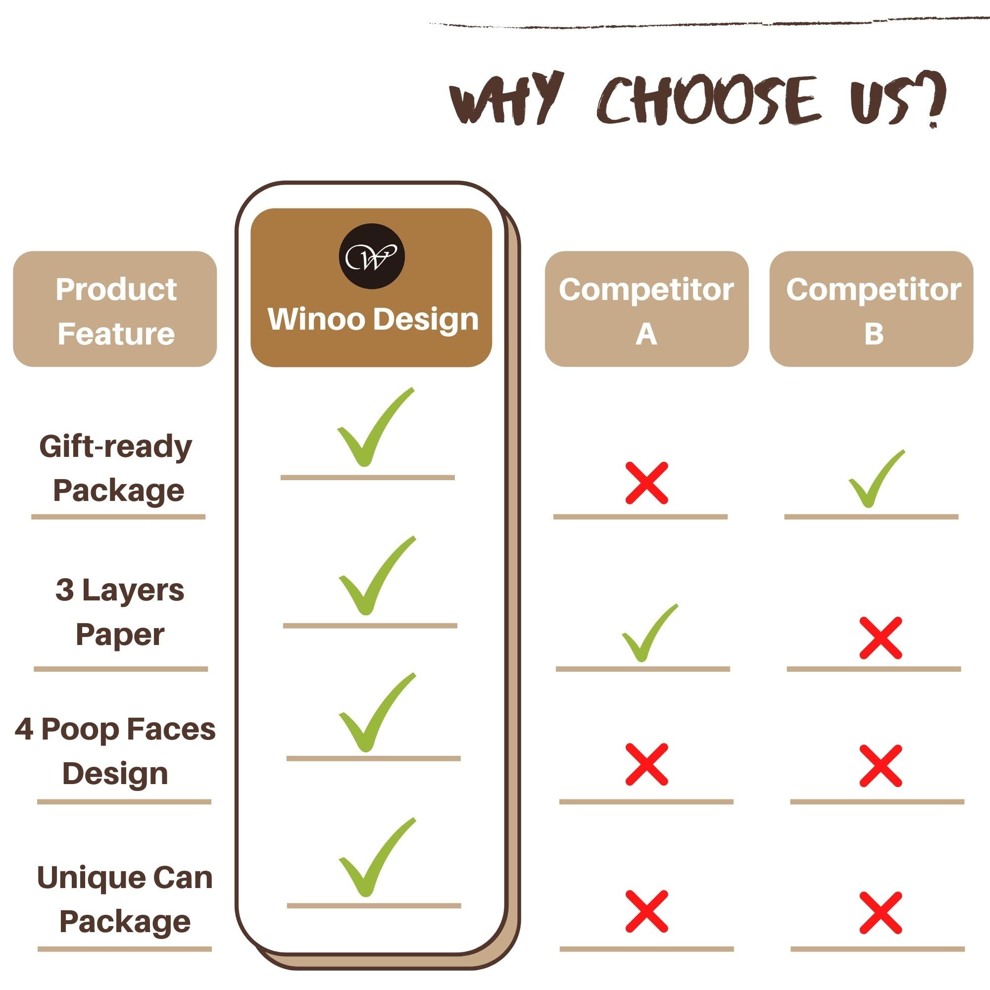 Funky 4 Patterns Design: It's originally designed and printed by Winoo. Every sheet of the roll has 4 different poop facial expressions to make this gag tissue paper roll more hilarious.