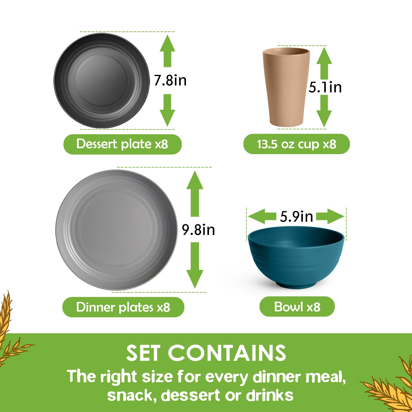 PACKAGE INCLUDE: This wheat straw dinnerware sets include 32 pieces in total. Bright color bring you a fresh look and make it easy to match your existing flatware.