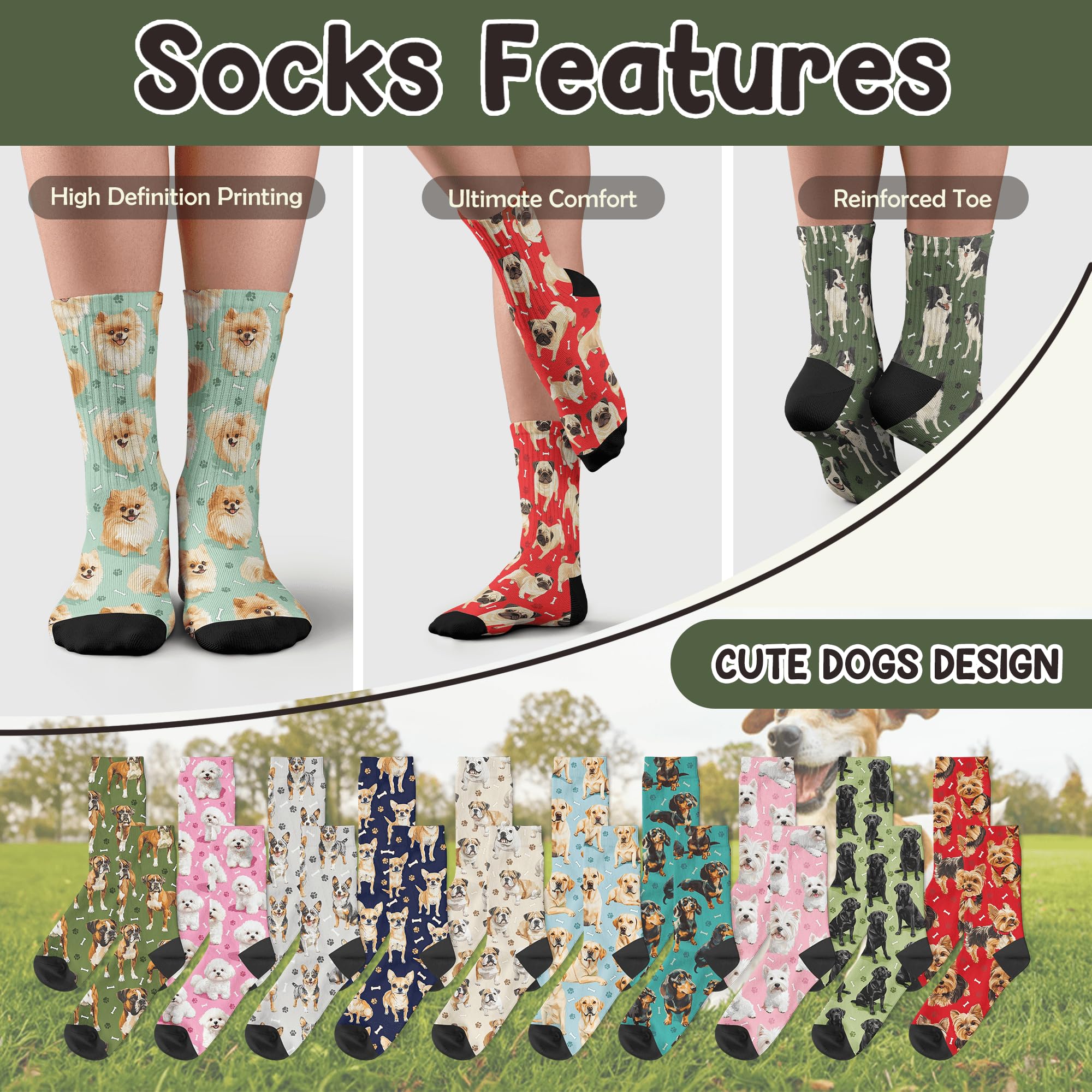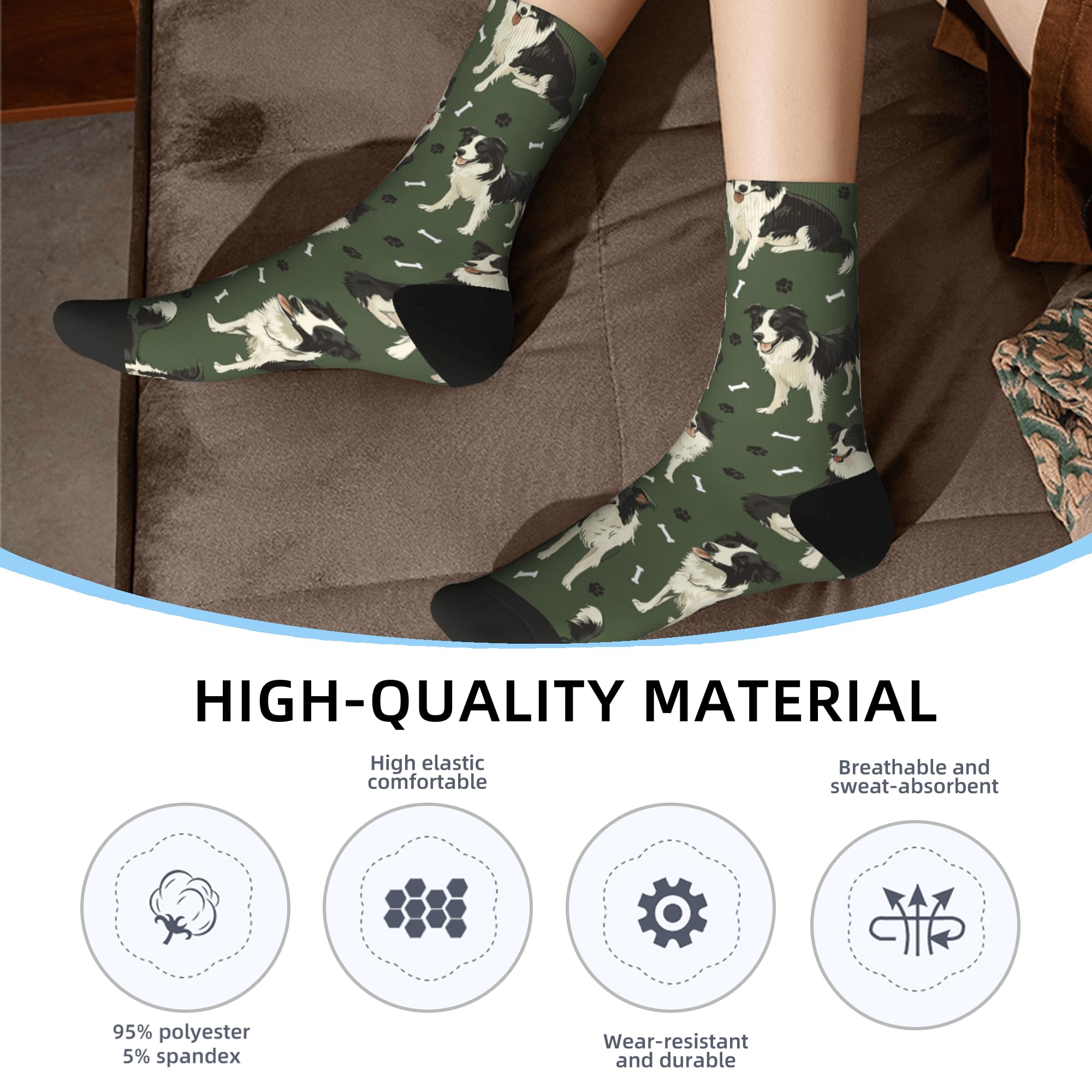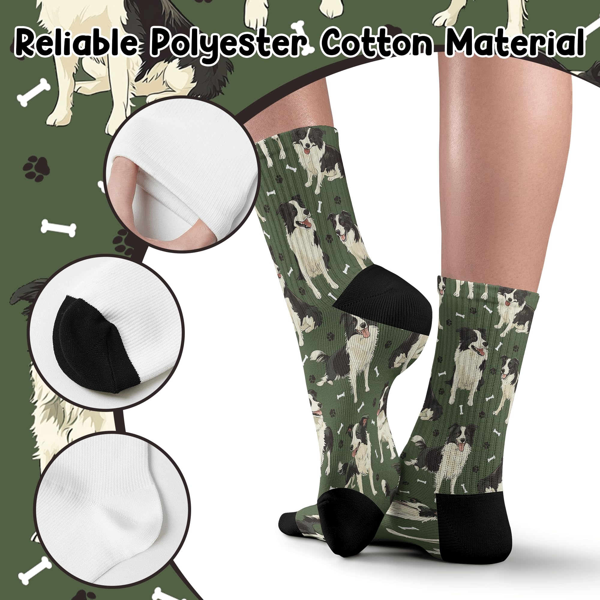 QUALITY MATERIAL: Our dog print socks are designed with a comfortable composition of 90% Polyester and 10% spandex for a flexible fit. They won't fade and are machine washable.