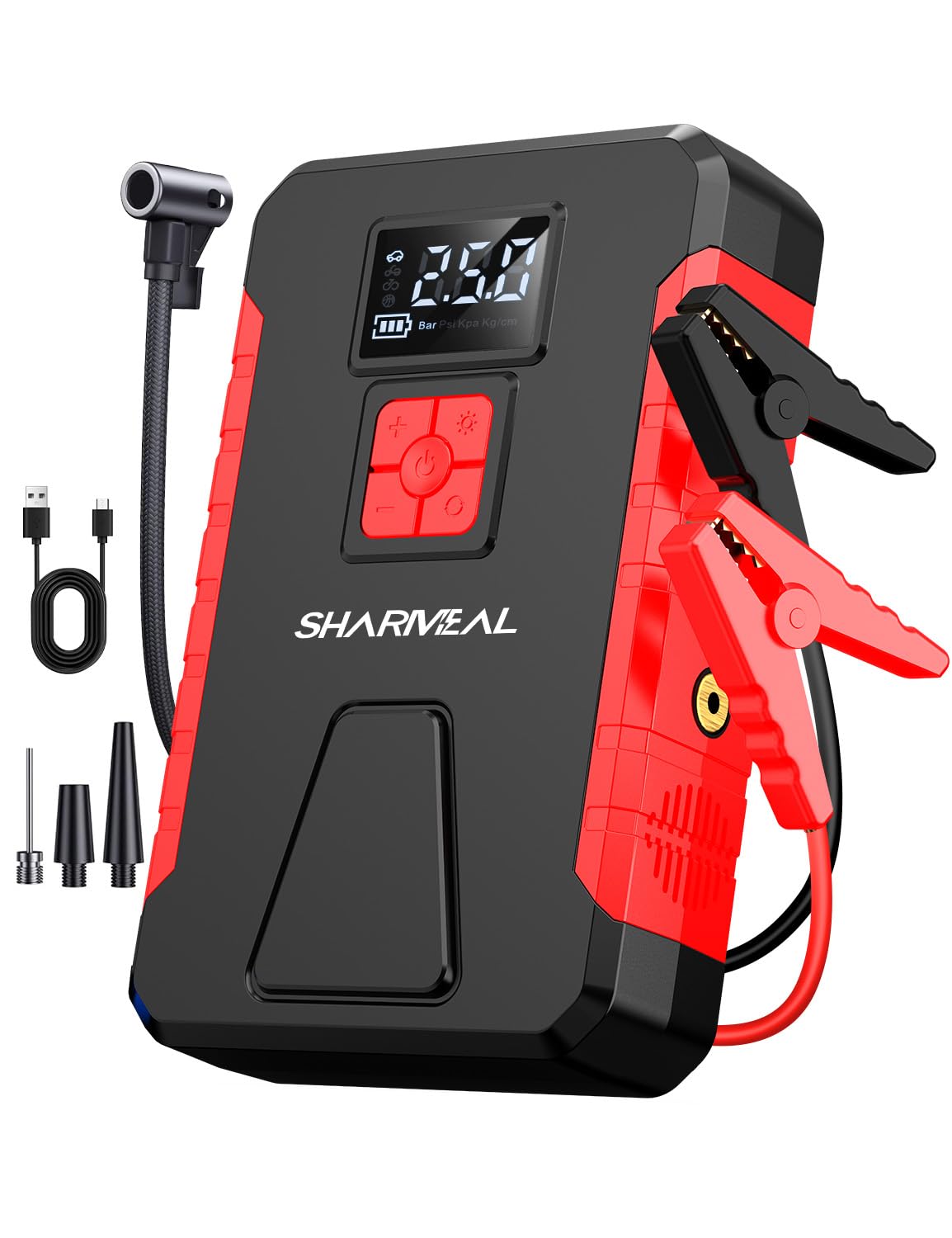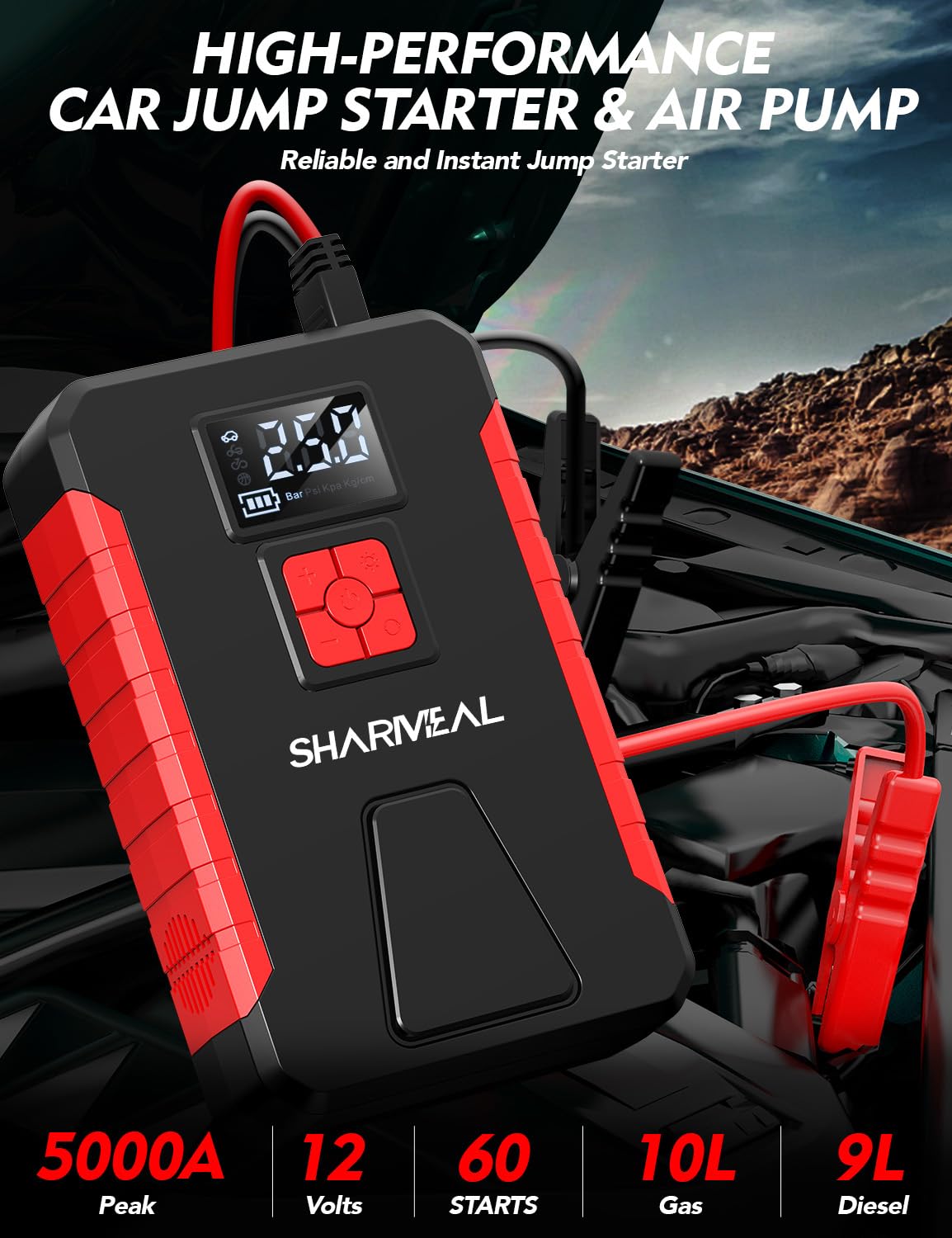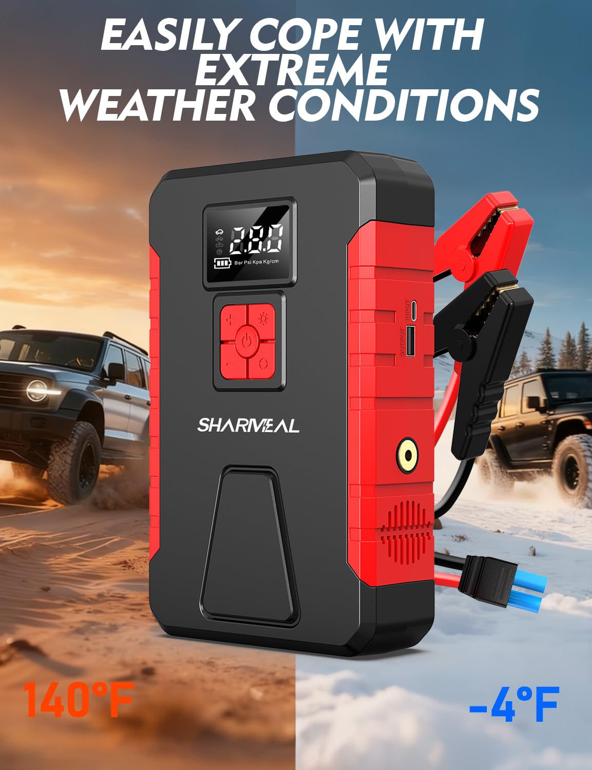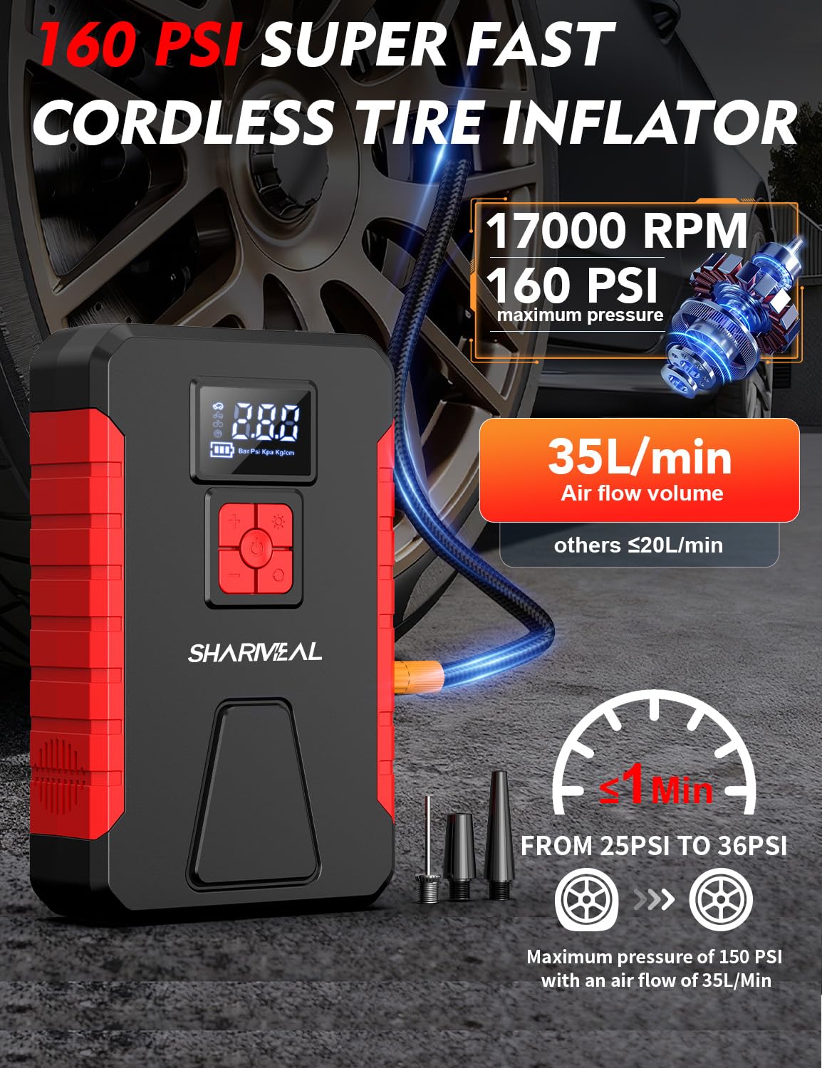 ➤【Jump Starter with Air Compressor】 A built-in air compressor automatically stops inflation at a preset PSI (up to 160 PSI) to prevent overinflation.