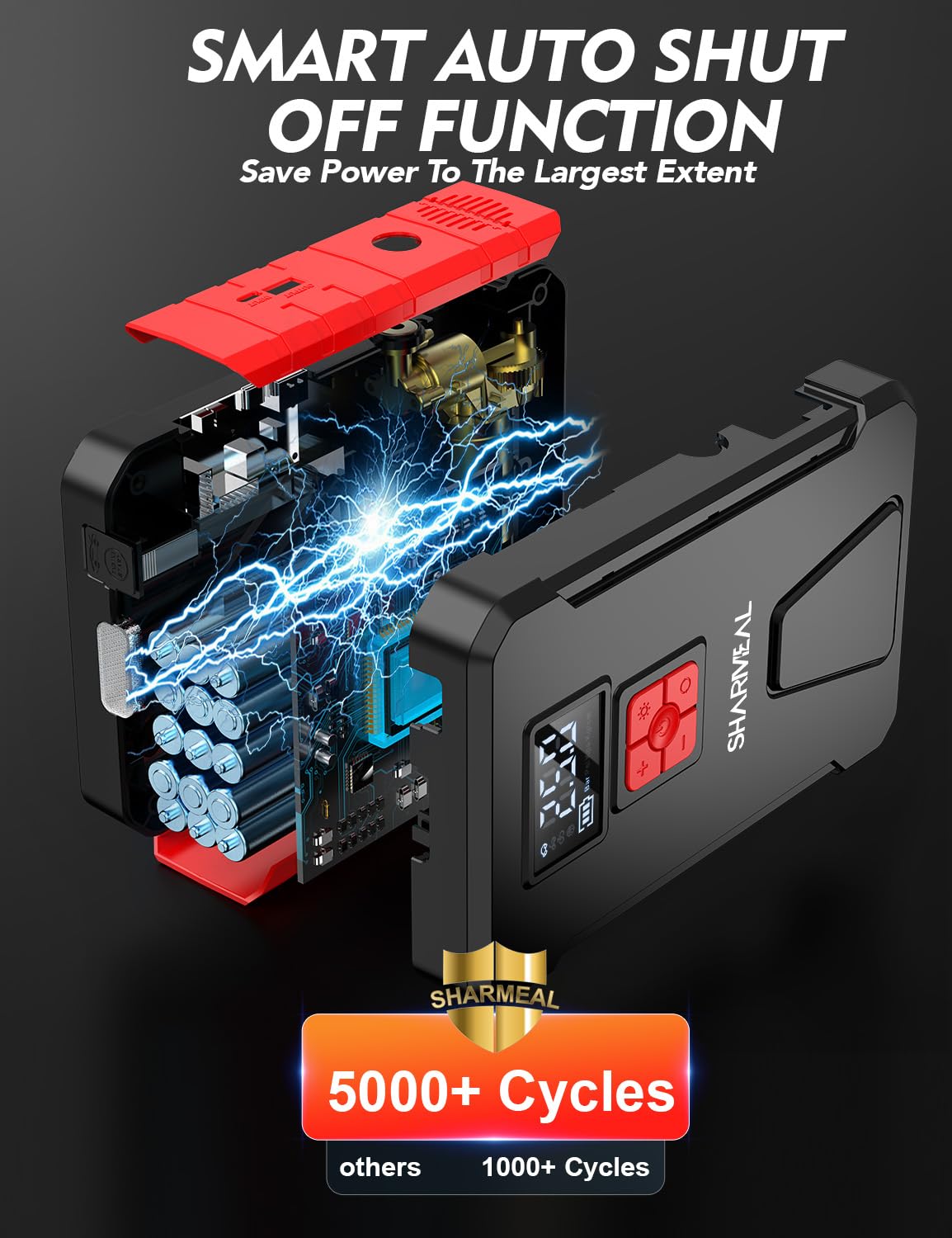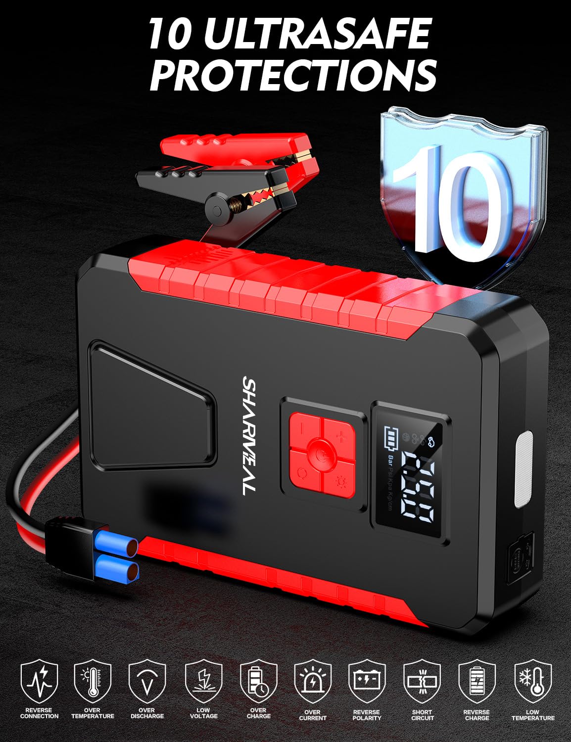 ➤【All-Around Defense 】This car jump box with air compressor offers 14 key protections, including short circuit protection, overcurrent protection, reverse connection protection, overheating protection, and overcharge protection.