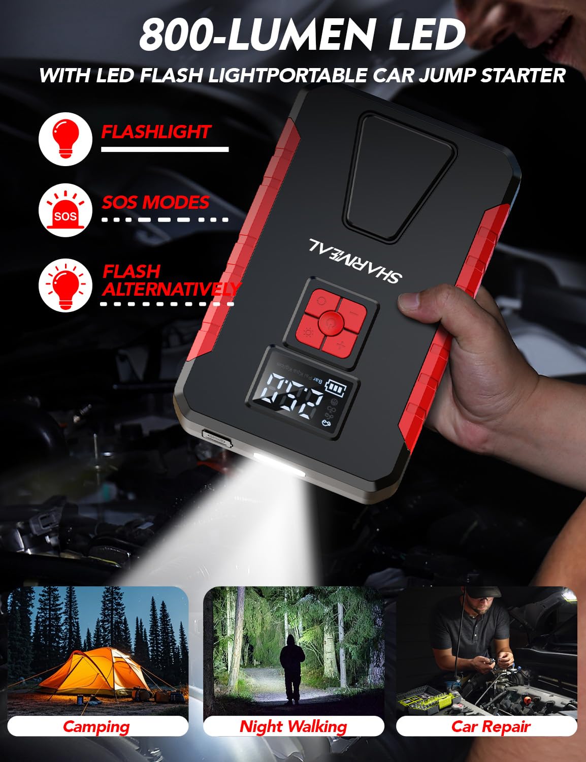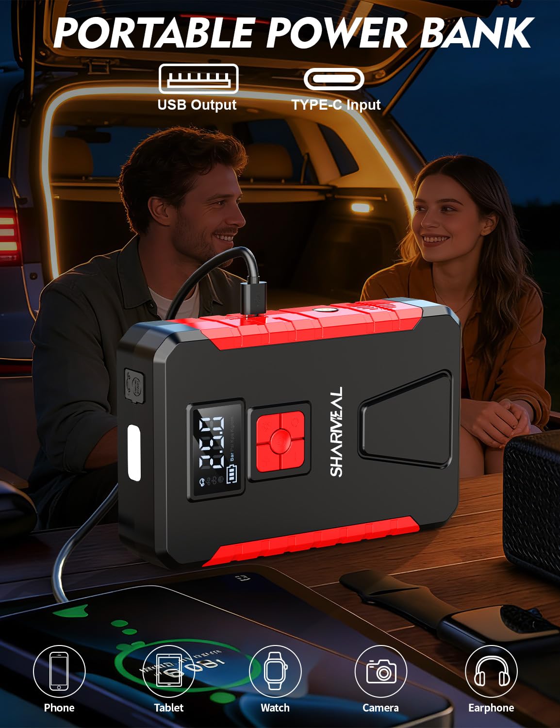 ➤【Multi-Function 】 This product is not only a portable car battery charger jump starter and a tire inflator, but also a portable power bank, an LED flashlight(3 Modes: Flashlight, Strobe Light, and SOS Light). Compatible with USB devices such as smartphones and tablets.
