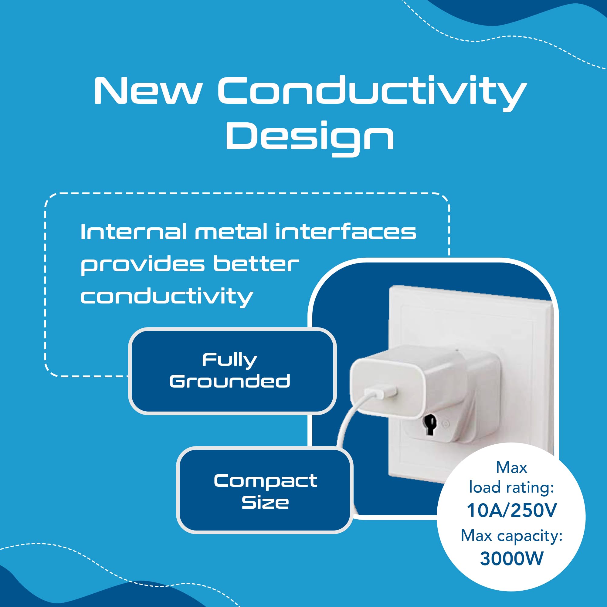 Grounded 3 prong plug. Max capacity up to 3000 watt (max 250 volt, 13 a)