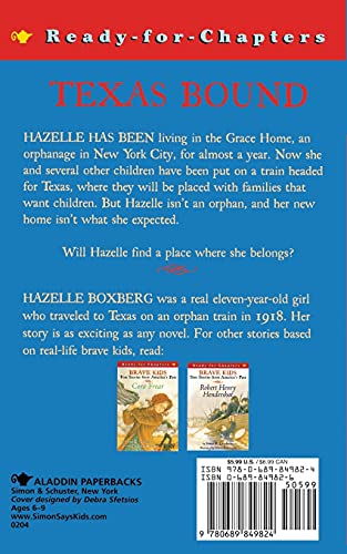 Texas Bound Hazelle has been living in the Grace Home, an orphanage in New York City, for almost a year. Now she and several other children have been put on a train headed for Texas, where they will be placed with families that want children. But Hazelle isn't an orphan, and her new home isn't what she expected. Will Hazelle find a place where she belongs? Hazelle Boxberg was a real eleven-year-old girl who traveled to Texas on an orphan train in 1918. Her story is as exciting as any novel.