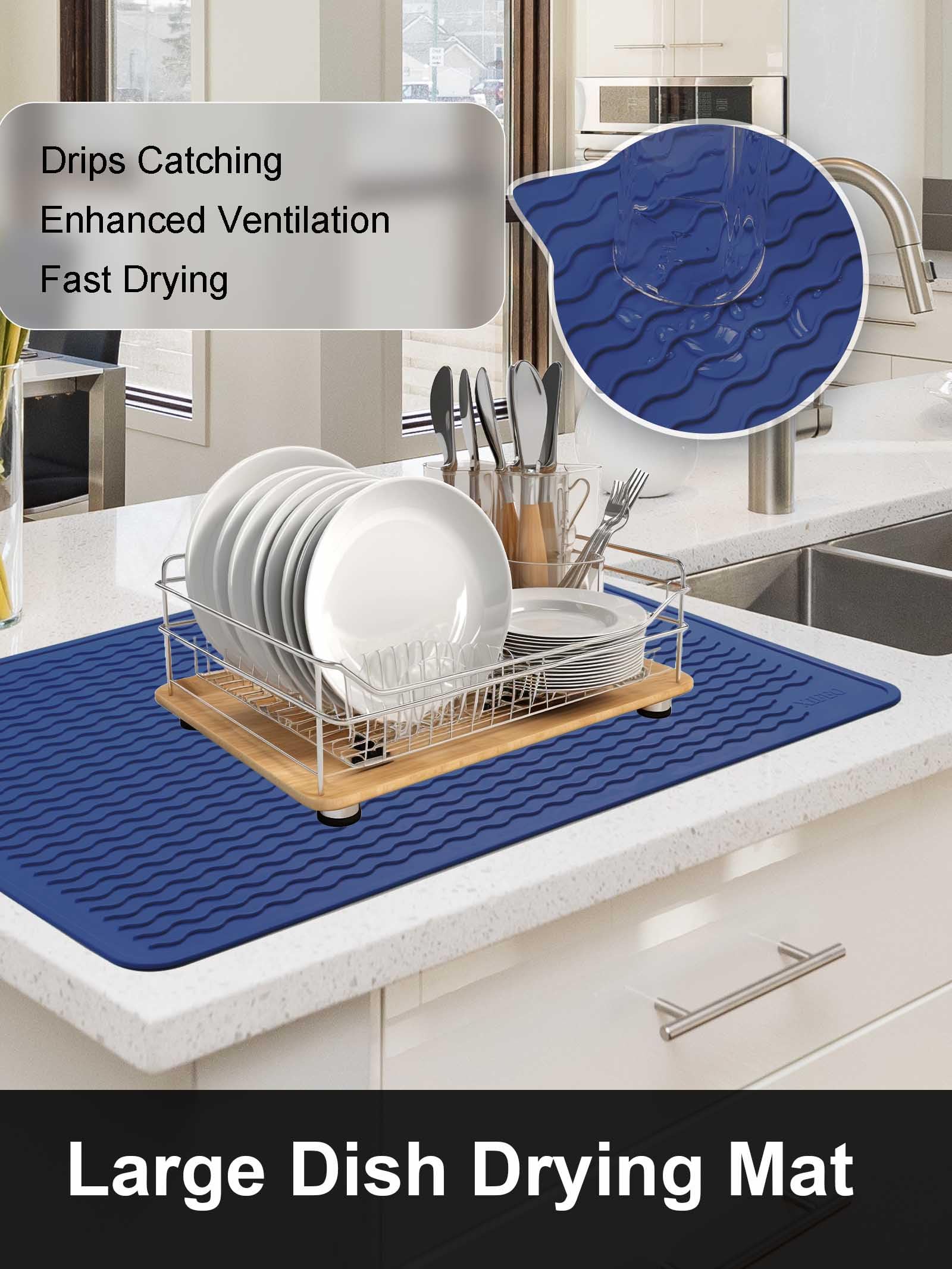 [Dish Drying Mat] This uniquely designed wave ridge can enhance air circulation for improved ventilation while capturing drips from dishes, glasses, fruits, and veggies. Its high edges and waterproof bottom prevent spills, keeping countertops dry and pristine, making it the perfect kitchen drying mat.