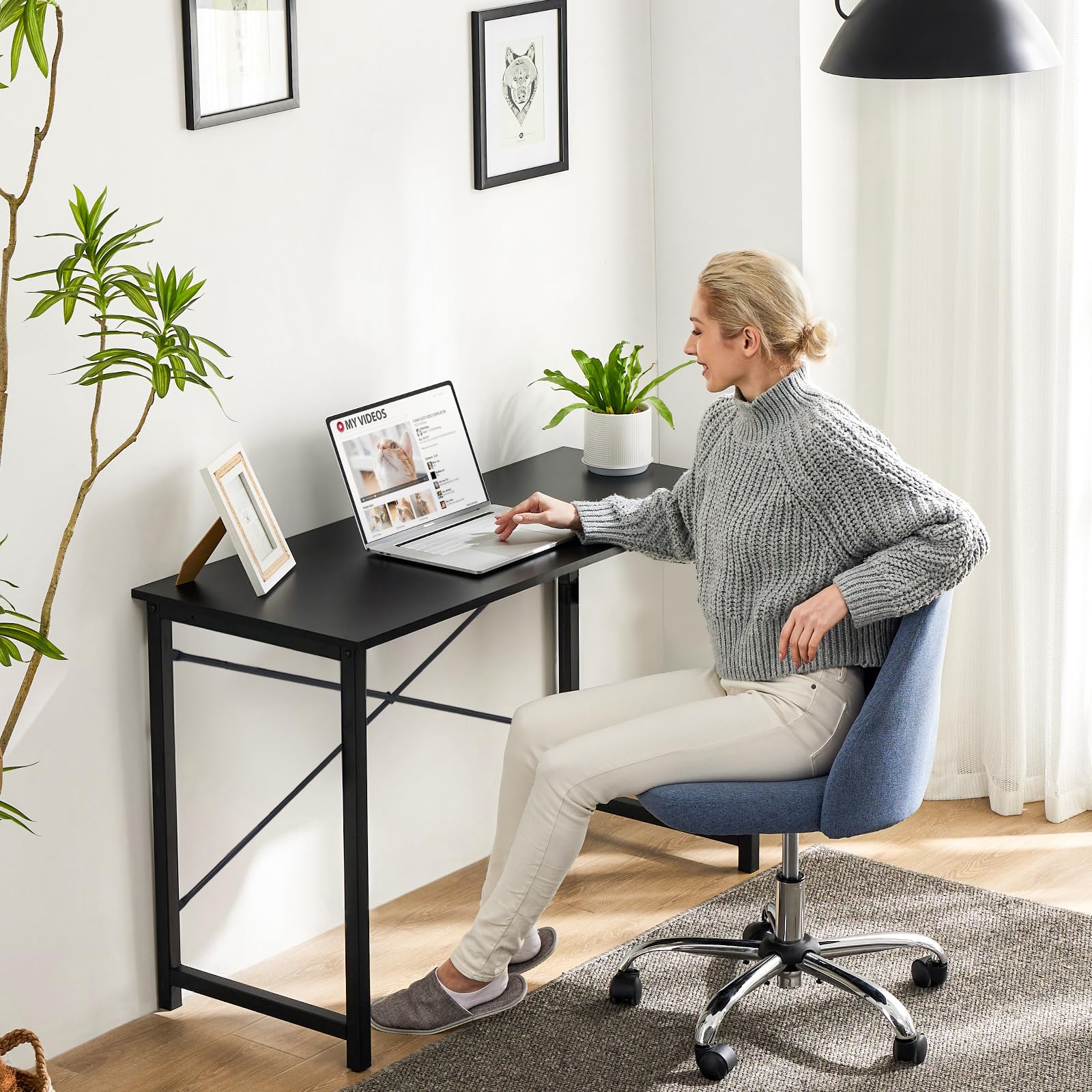 High-Quality Design: The writing desk is made of high-quality materials. The desktop is made of thick particle board, which is resistant to scratches, water, and damage, making it easy to clean. The metal frame and corner reinforcement structure provide reliable support for all day use, weighing up to 176 pounds