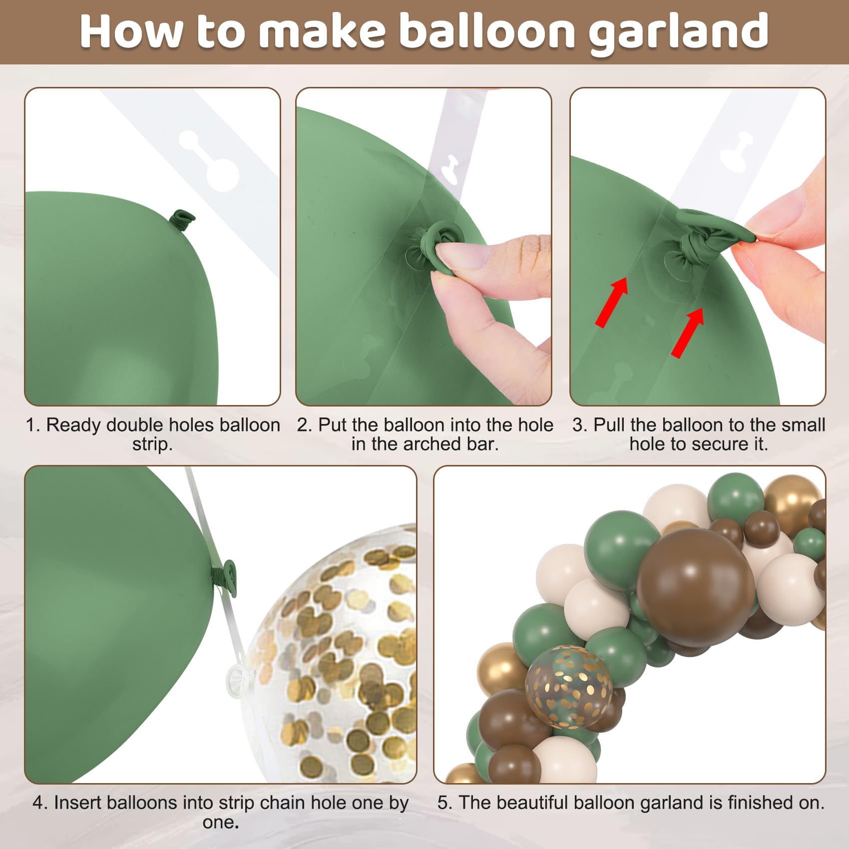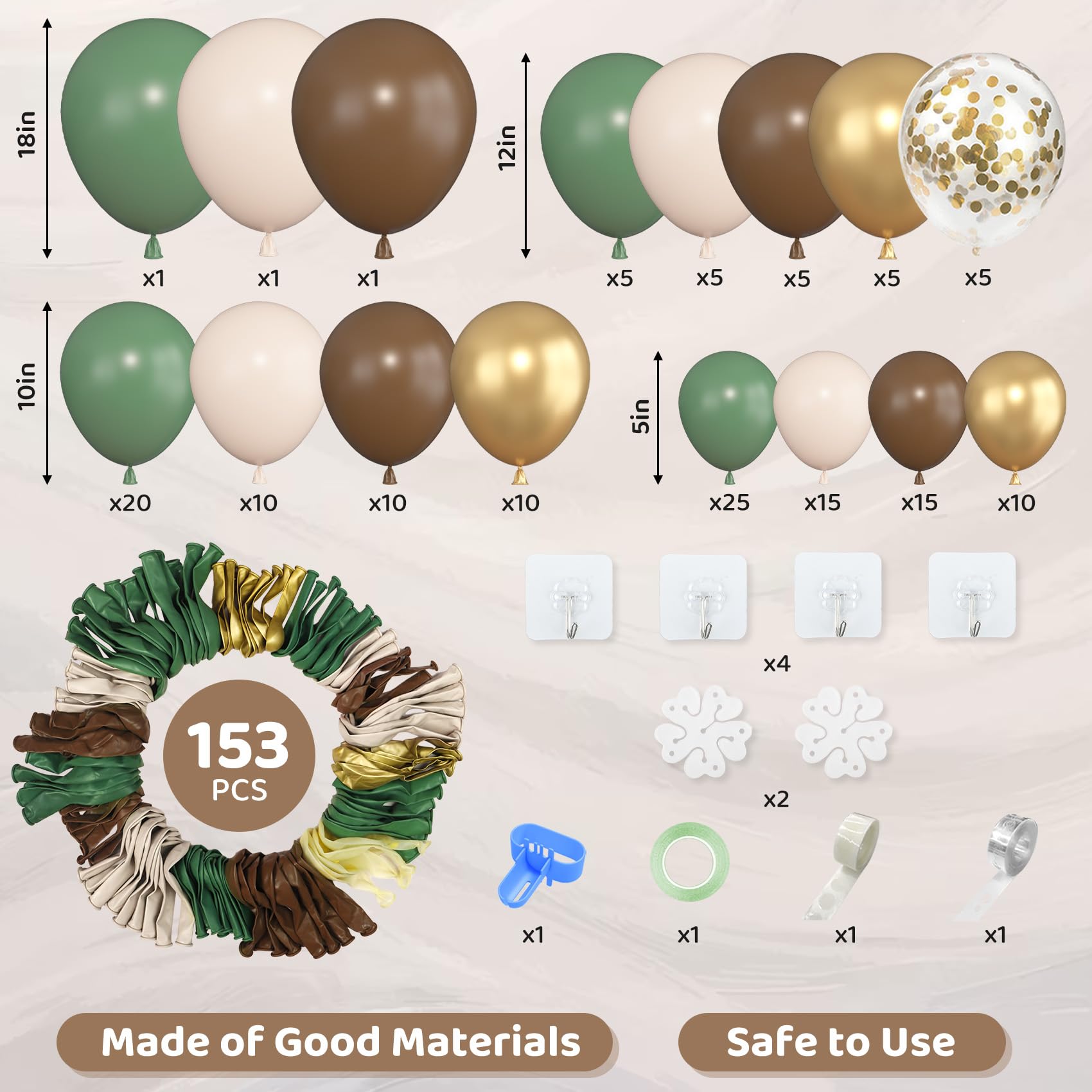 Sufficient Quantity of Sage Green Balloons: The safari balloon arch kit includes 18" sage green/white sand /brown balloons(3 pcs), 12" sage green/white sand /brown /metallic gold /confetti gold balloons(25 pcs), 10" sage green/white sand /brown /metallic gold balloons(50 pcs), 5" sage green/white sand /brown /metallic gold balloons (65 pcs), 10pcs balloon tools(balloon arch strips, tying tool, 100 glue points, ribbon, flower balloon clip, hook