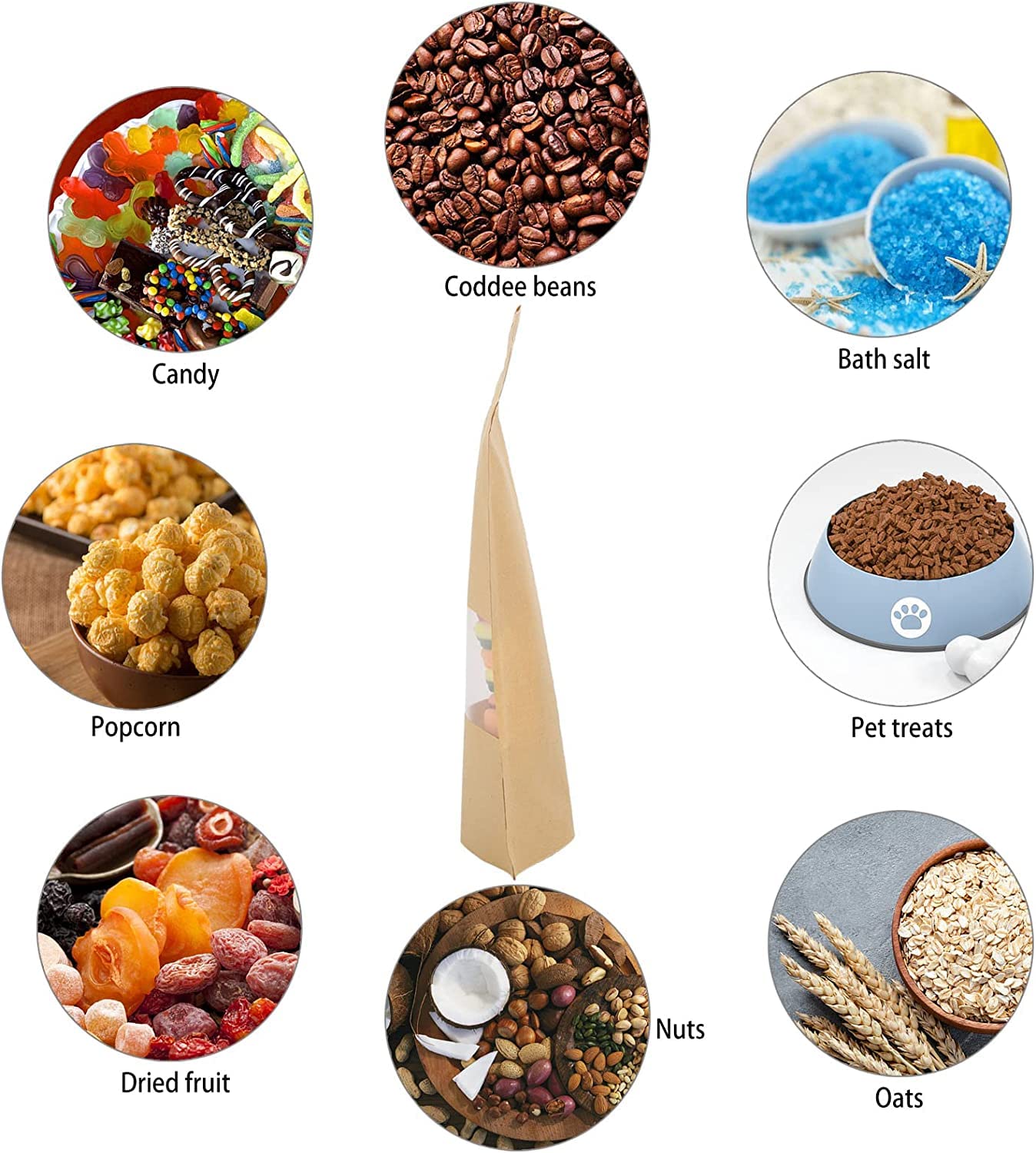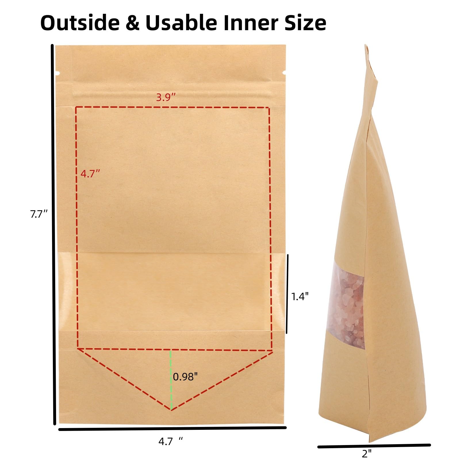 100pcs Kraft Paper Treat Bags with Window, Ziplock Stand Up Pouches for Packing Food Cookies Snacks