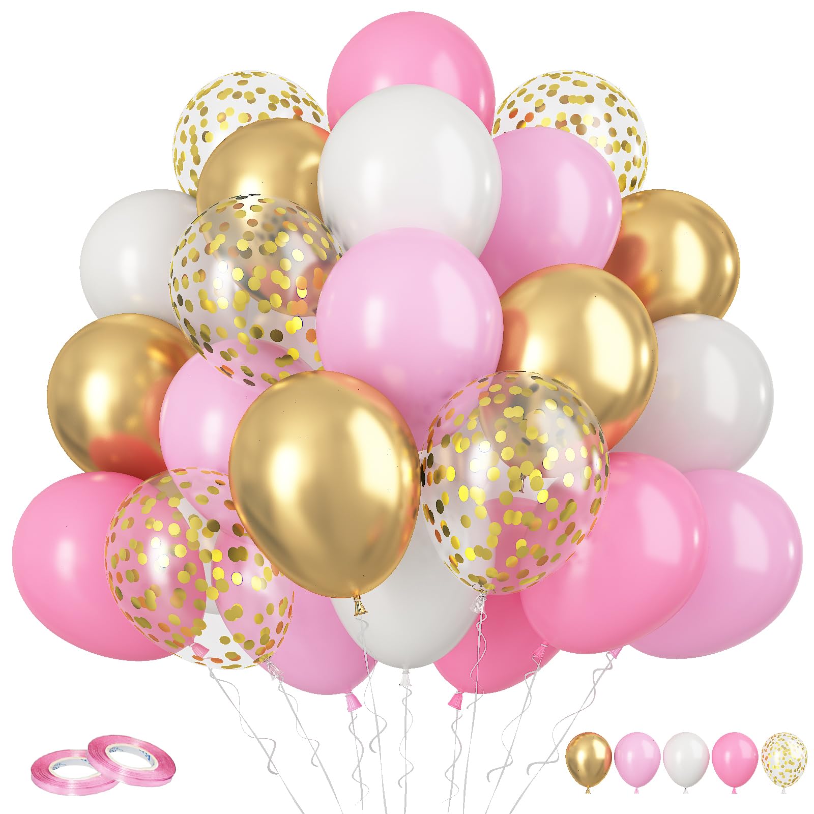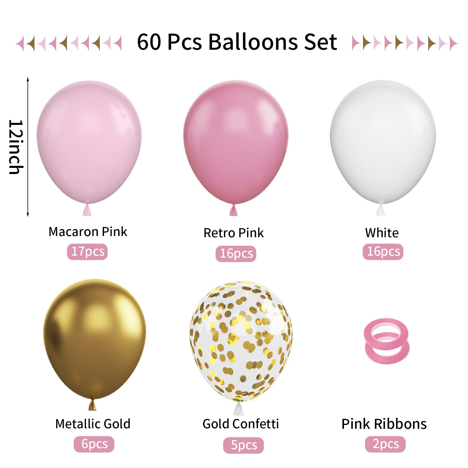 Package Included : Our pink and gold balloons set includes 60pcs 12inch latex balloons. 17pcs macaron pink balloons, 16pcs retro pink balloons, 16pcs white balloons, 6pcs metallic gold balloons, 5pcs gold confetti balloons and 2pcs pink ribbons