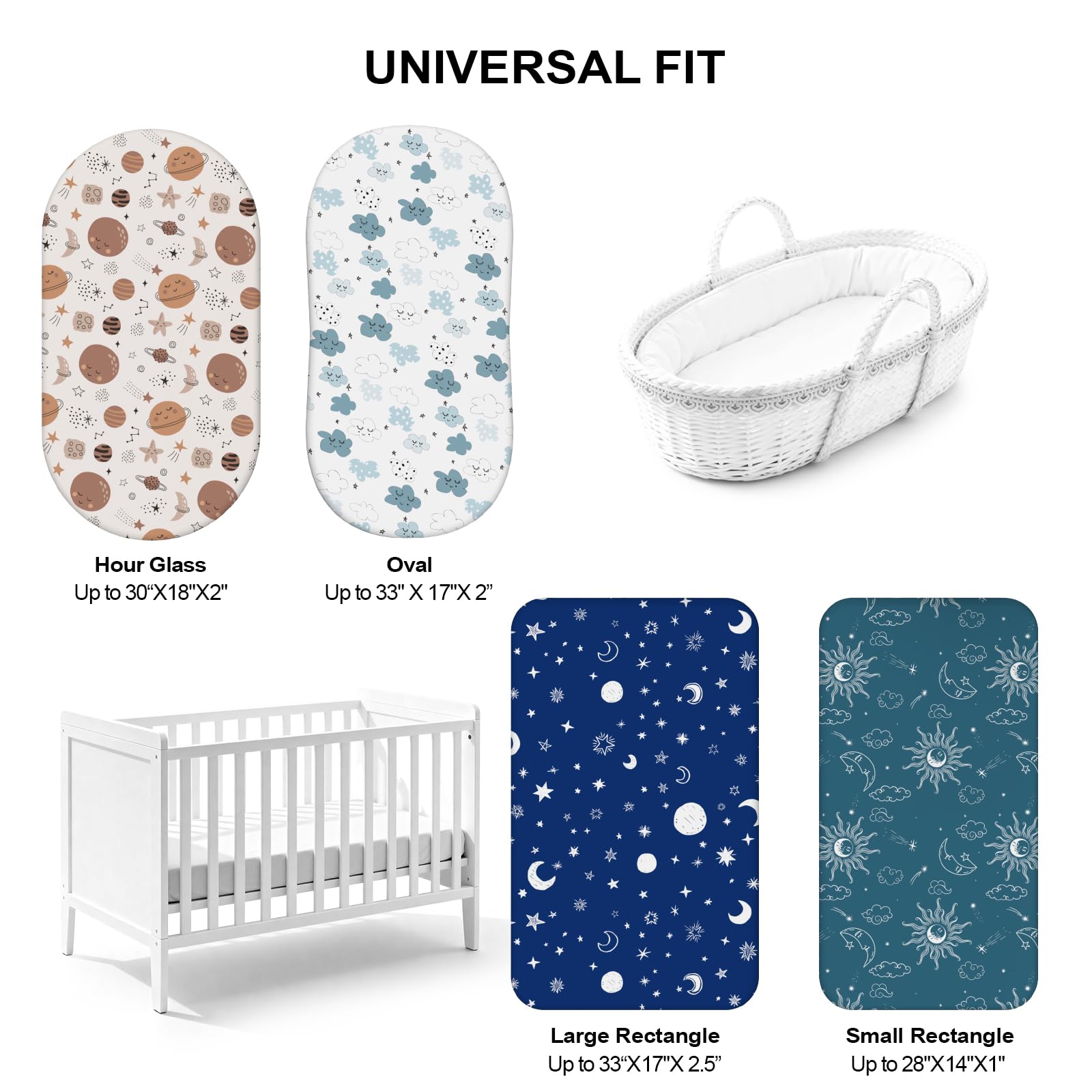 Perfect Fit: The soothing bassinet fitted sheet measures 32x16 inches and is up to 4 inches thick, making it compatible with a wide range of mattress brands. It's compatible with hourglass, oval, rectangular, and round bassinet shapes, providing comprehensive protection for your baby.