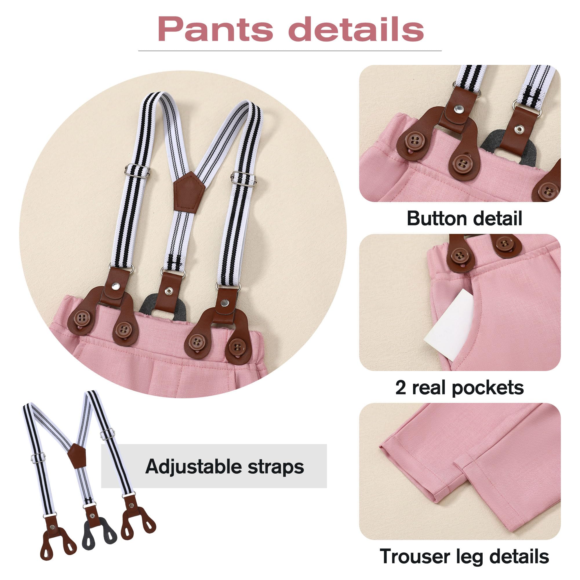 Fashion Suit: A fashionable baby boy suspenders outfit that is easy to wear and exercise, making your little boy look elegant and gentlemanly. You can remove the straps to create a casual look