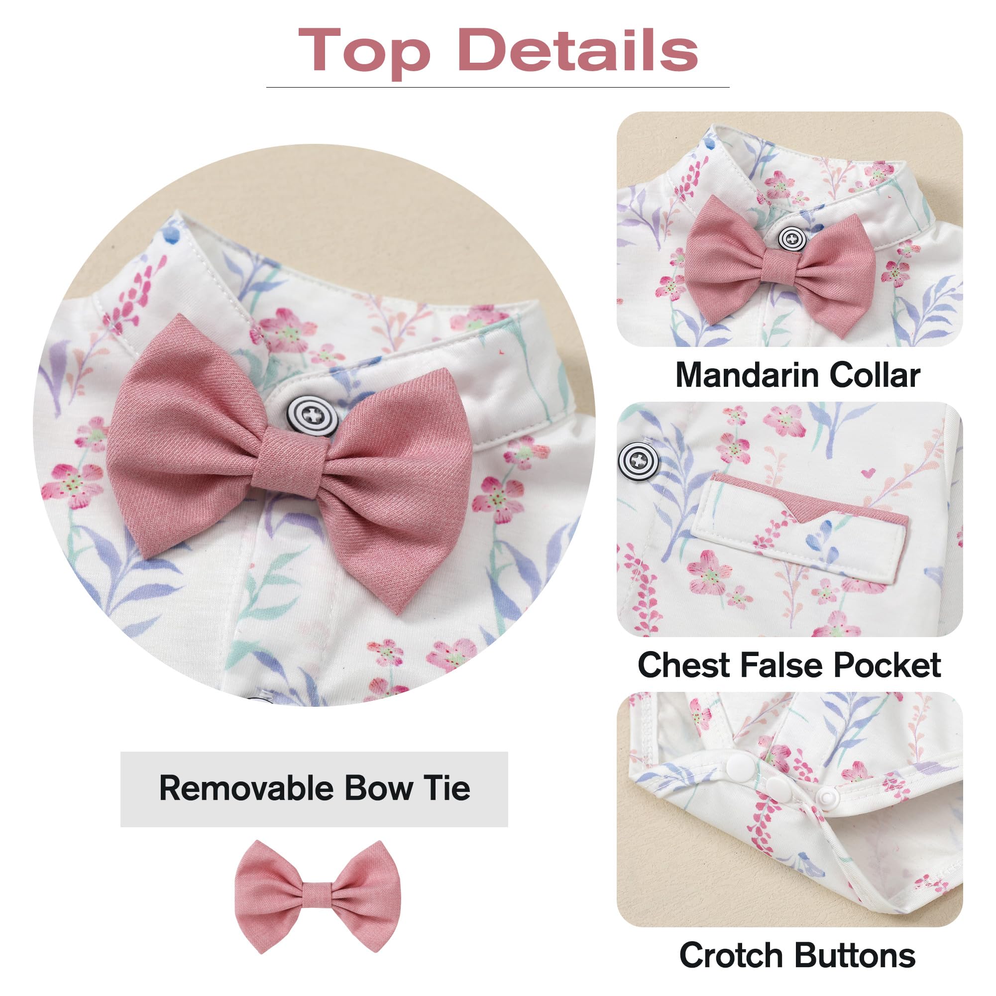 Unique Design: The baby boy suit shirt features a unique stand-up collar design and detachable bow tie, which is fashionable and cute, without worrying about neckline curls or wrinkles. This shirt has buttons on the crotch for easy on and off and diaper changing