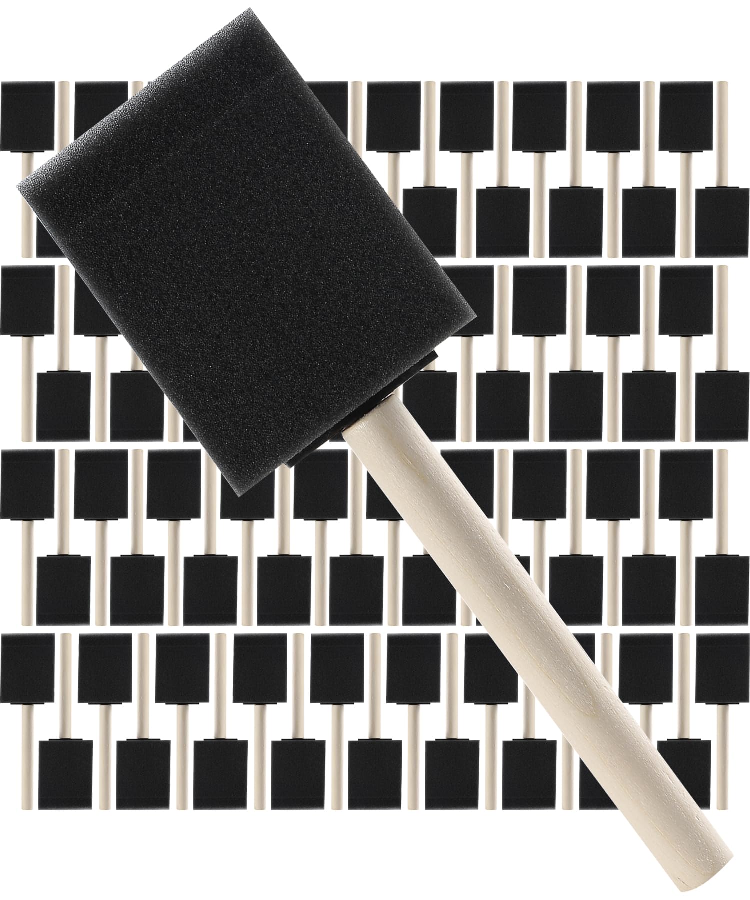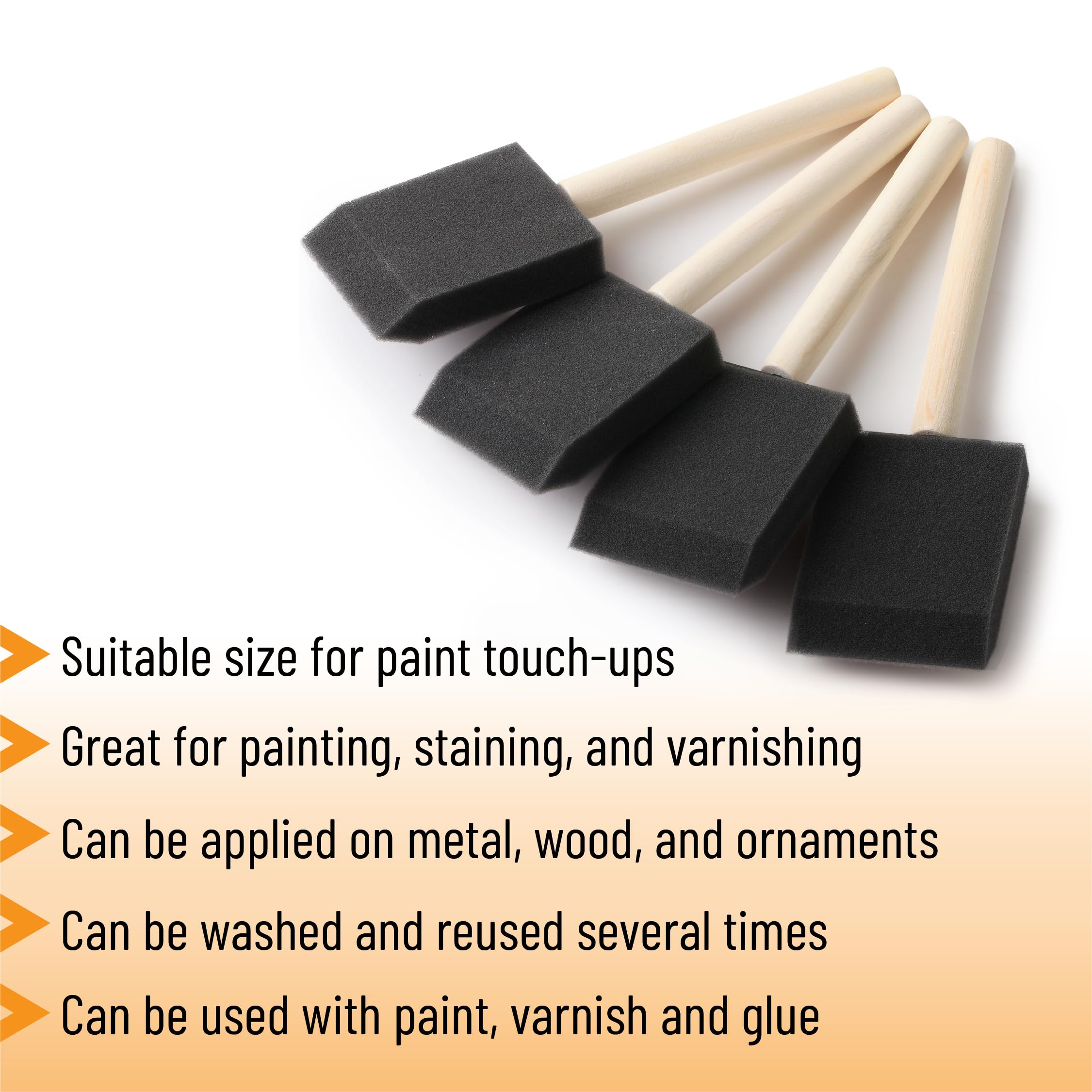 Each brush is constructed with a lightweight wooden handle and a dense foam head that applies coatings smoothly and evenly.