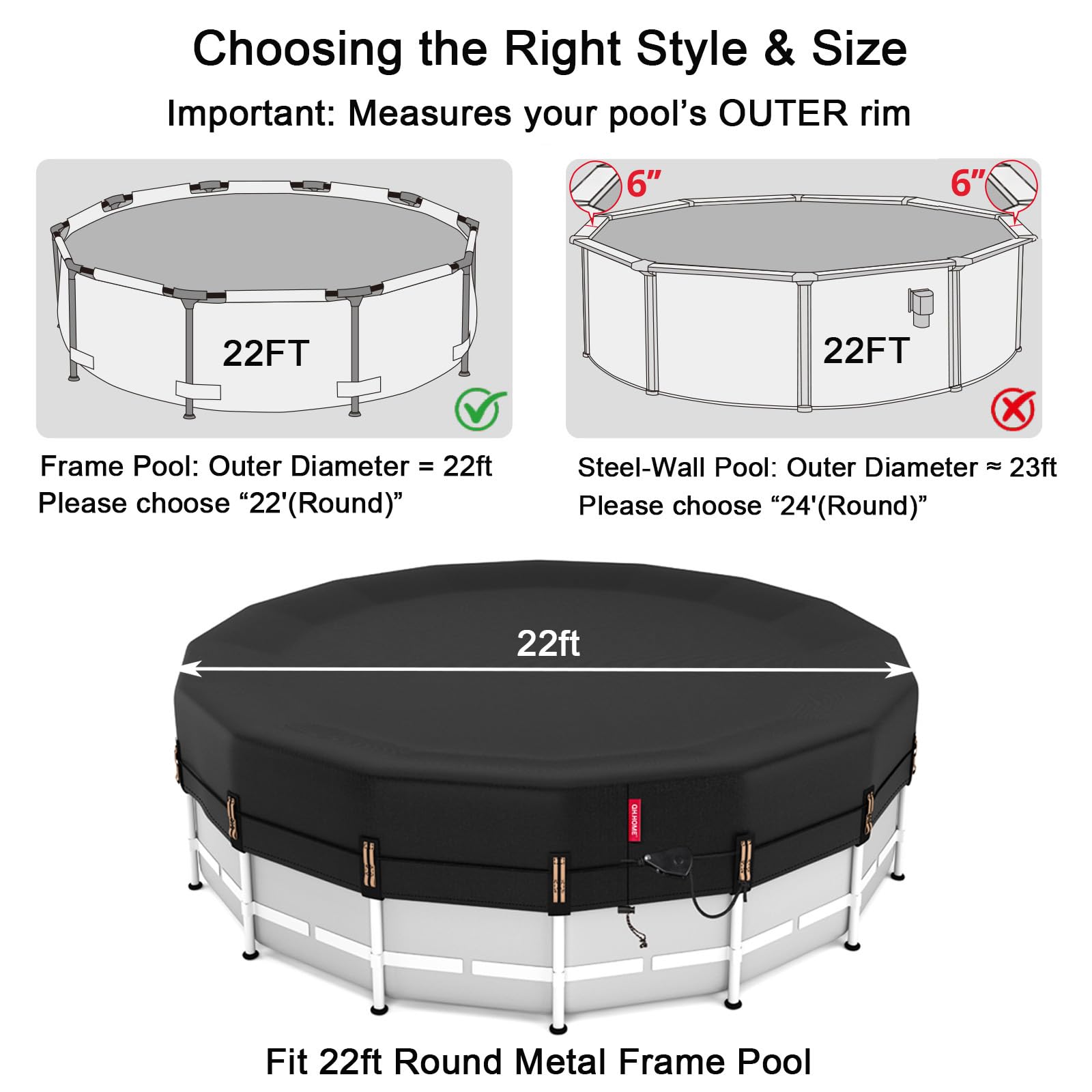 【Choose the right size and style for a snug fit】The QH.HOME 22ft round pool cover is designed for Bestway/Intex/Coleman and most other brands of 22ft round above-ground metal frame pools. If you are using a 22ft round steel wall pool, please select the "Steel Wall" style. Alternatively, you can consult customer service for a recommended size for the best fit.