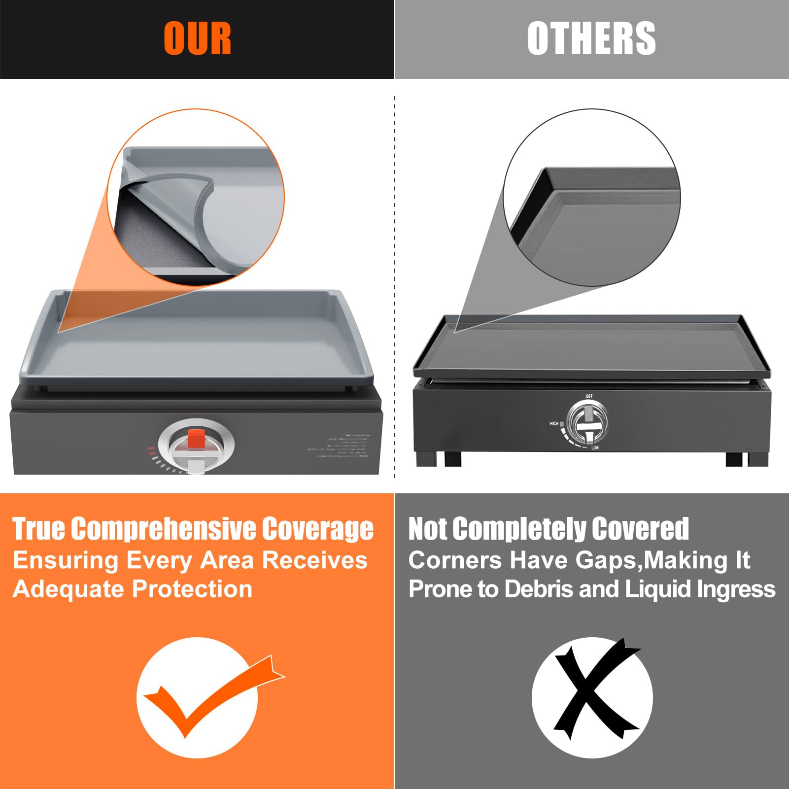 【FULL COVERAGE DESIGN】: Unlike other blackstone griddle mat that leave gaps in the corners, our innovative silicone griddle mat provides full coverage, ensuring every inch of your cookware is fully protected from pesky pollen, leaves, and more.