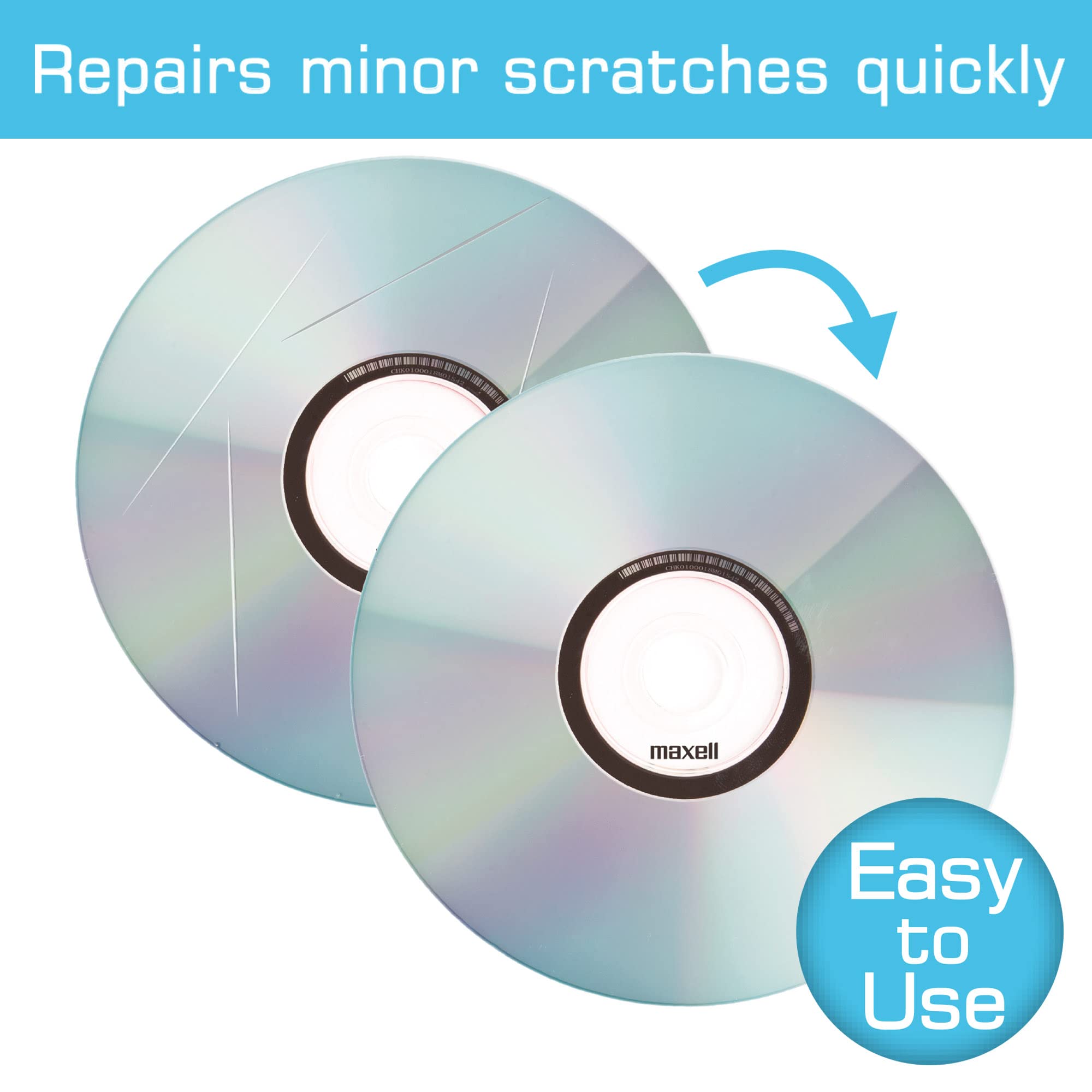 DISC SCRATCH REPAIR KIT: Maxell Disc Scratch Cleaner repairs scratches and skipping on different types of discs, including CDs, DVDs, music CDs, CD-ROMs, and game discs. Restores optimal disc performance.