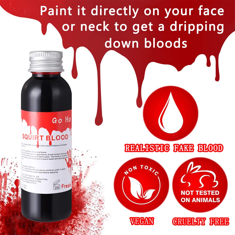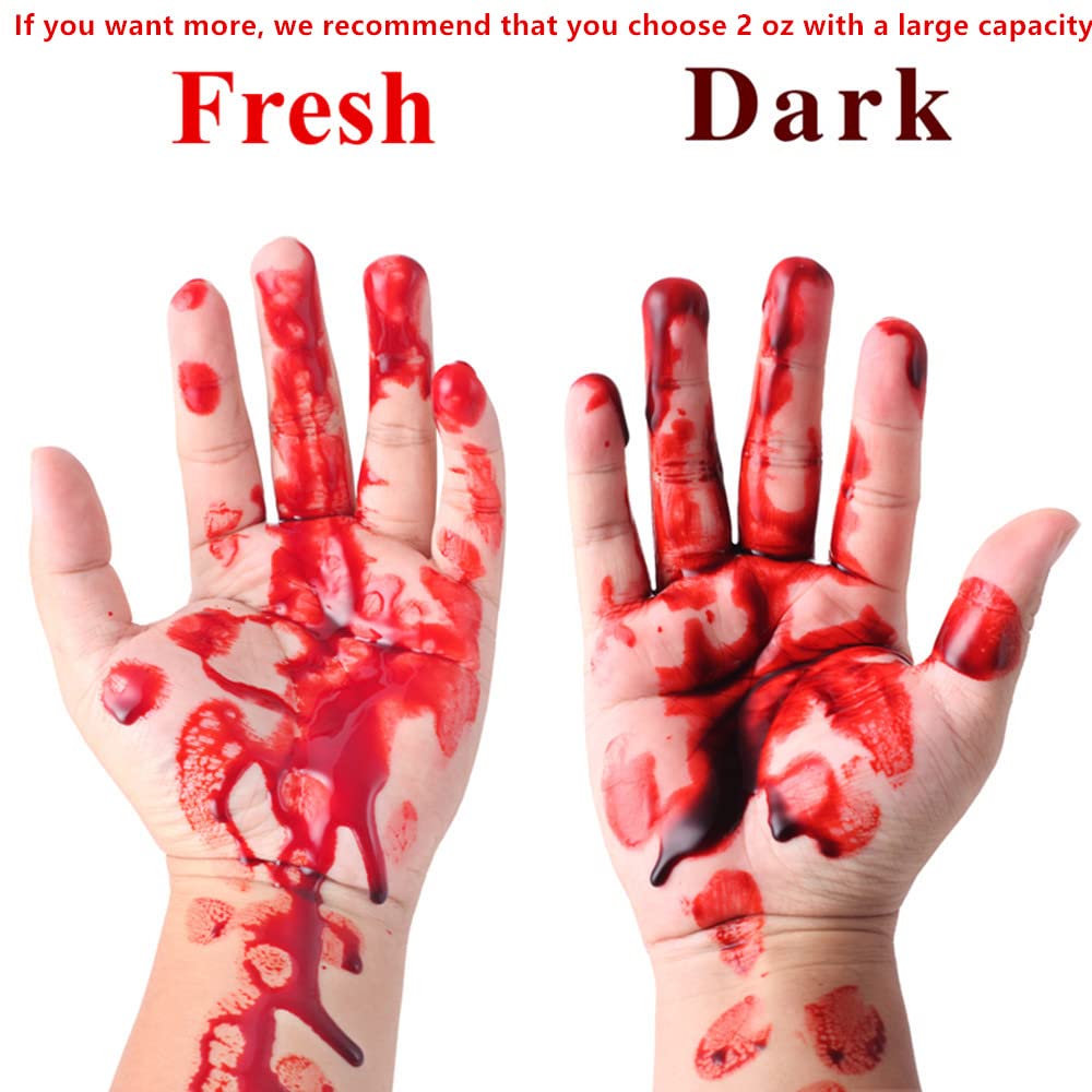 【Vegan and Non-toxic】Made of safe material,Hypoallergenic,will not irritate skin.If you want more, we recommend that you choose our 2 oz fake blood with a large capacity.Attention:Advise to do a small skin patch test before applying.