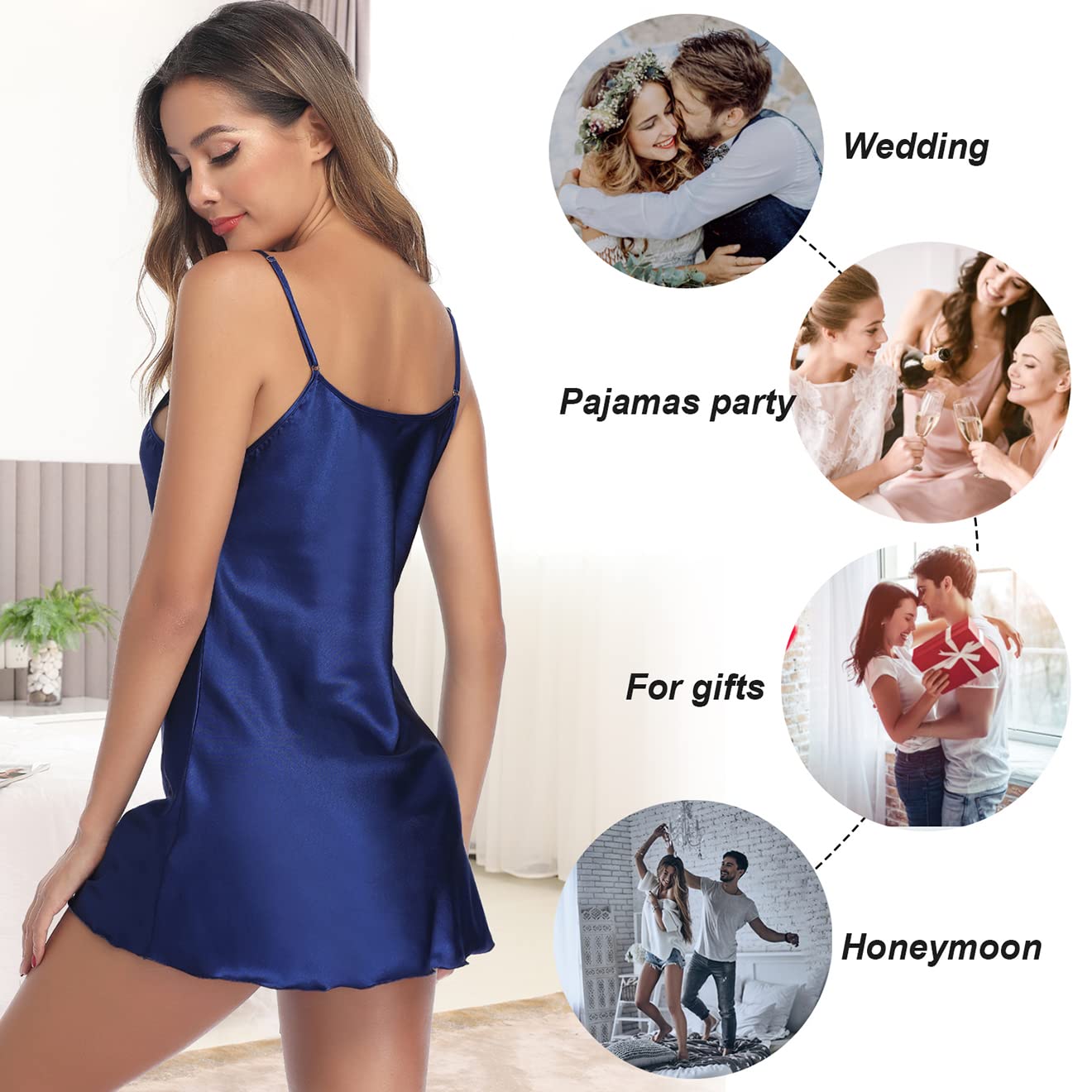 Features: Full slip chemise nightgown sleepwear with adjustable spaghetti strap to create a casual and sexy look, deep v neck, ruffle hem,a-line style, simple and stylish designs make this satin mini dress looks more elegant and charming