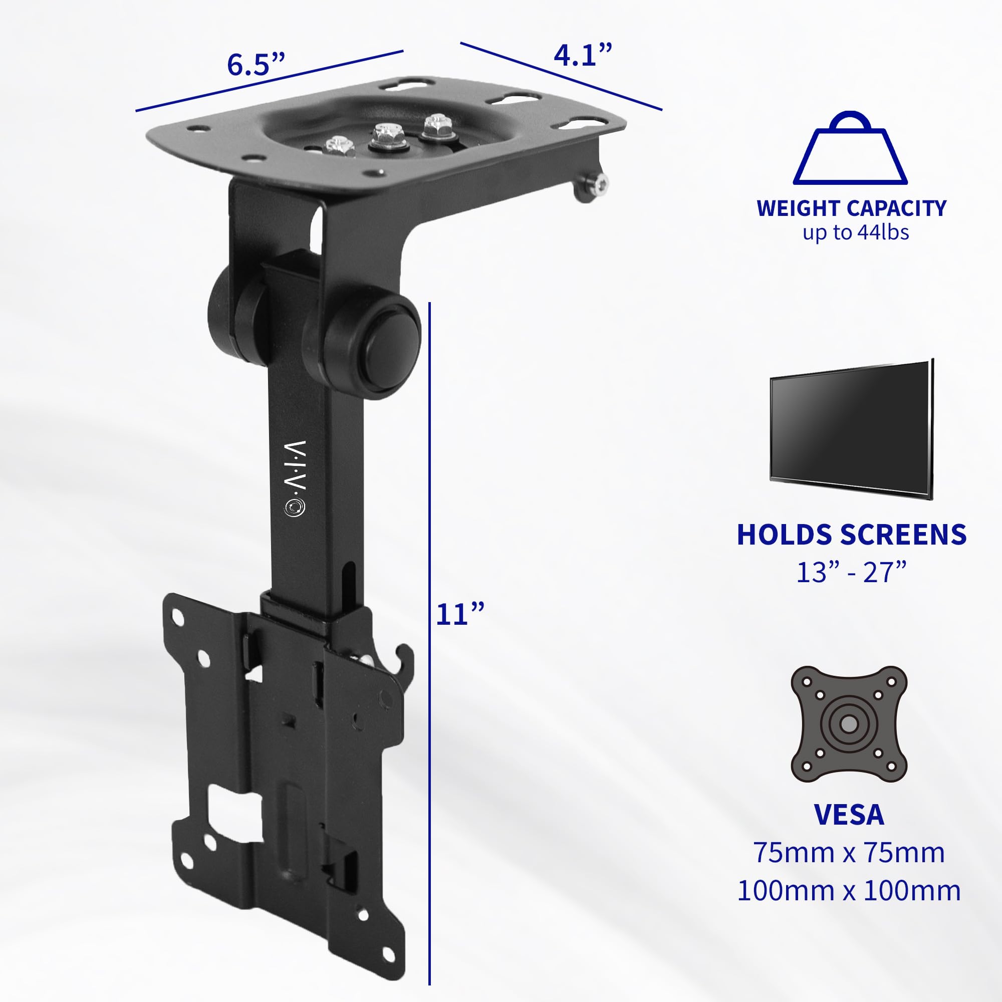 Compatibility - Fits Screens up to 13" - 27" screens with 75x75mm or 100x100mm mounting capability. Mounts to ceilings, cabinets (61cm deep cabinets only), upper desk shelving, and more. Please Note: Not for use in moving vehicle