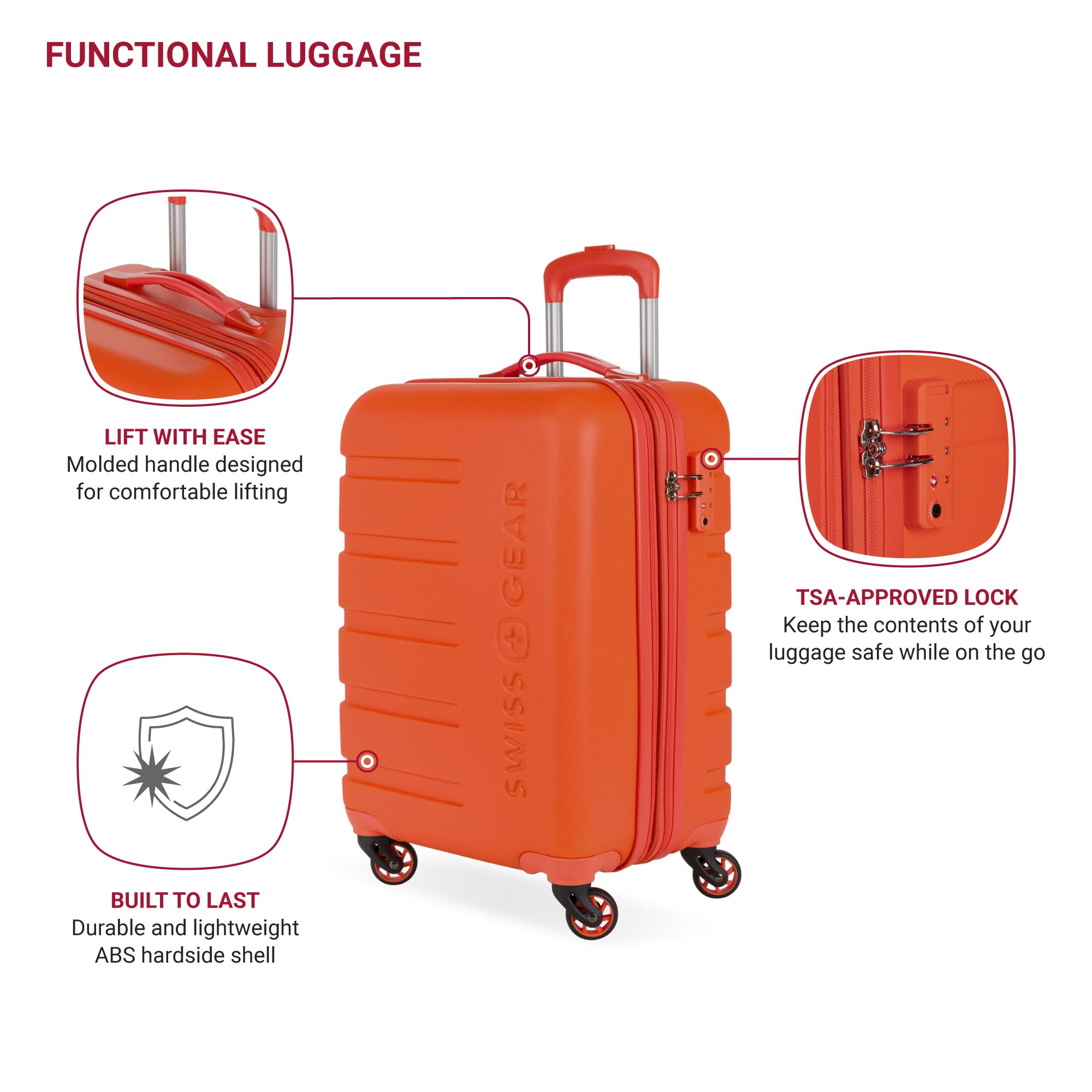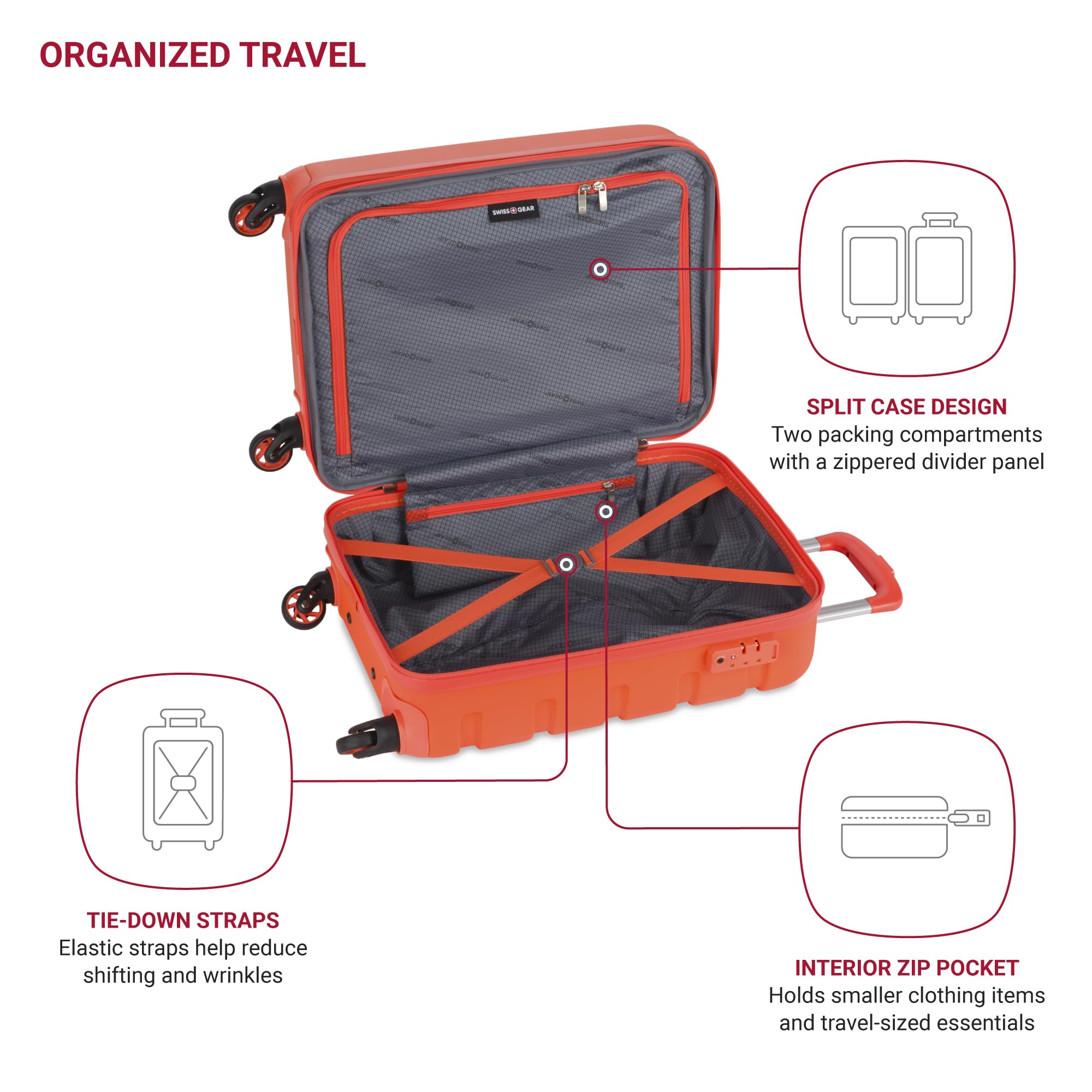 Description Experience ultimate convenience with the SwissGear Signature Hardside Expandable Carry-On with Cup Holder. Designed for frequent travelers, this 19-inch carry-on is made from durable ABS to withstand the wear and tear of travel. It features a split-case expandable design to maximize packing space while keeping belongings organized with multiple internal pockets. Equipped with eight 360-degree multi-directional spinner wheels and a push-button steel locking telescopic handle, this suitcase glides effortlessly through crowded airports. A unique built-in cup holder adds an extra level of convenience, allowing you to keep your beverage within reach while on the move. With outside dimensions of 22" x 14.25" x 10" and 19" x 14" x 10" of packing space, this compact yet spacious carry-on is ideal for short trips. Plus, it includes a 10-year warranty for peace of mind.