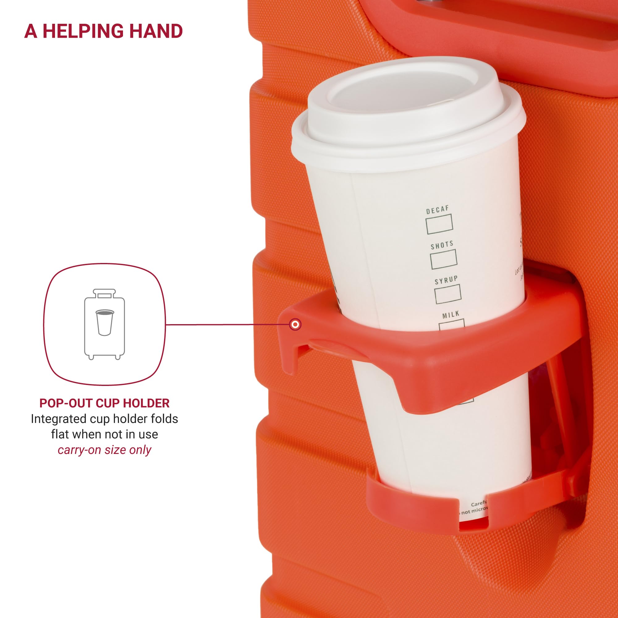 Four 360-Degree Multi-Directional Spinner Wheels: Designed for effortless maneuverability, allowing you to glide through busy airports and tight spaces with ease. Plus, the unique, patented built-in cup holder provides an extra helping hand on the go.