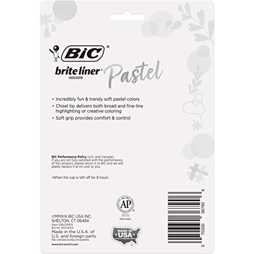Whether you're organizing your notes or underlining passages in a textbook, BIC Brite Liner Grip Highlighters make highlighting fun and easy. These ACMI-approved highlighters feature a textured rubber grip for comfort and super-bright fluorescent ink for emphasizing information. Each highlighter has a versatile firm chisel tip that allows you to seamlessly transition from broad highlighting to precise underlining. BIC Brite Liner Grip Highlighters are non-toxic and can be left uncapped for up to eight hours without drying out. Pocket clips make them easy to bring everywhere.