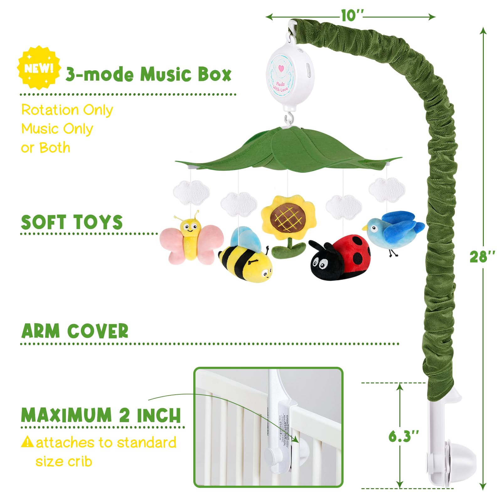 Charming Design: Bring a touch of nature’s magic into your baby’s nursery with this enchanting crib mobile. Featuring adorable plush insects—a butterfly, a bee, a ladybug, and a bluebird—alongside soft clouds and a cheerful sunflower, this mobile creates a delightful garden theme. Suspended beneath a lush green leaf canopy, it adds a soothing and whimsical charm to any nursery decor
