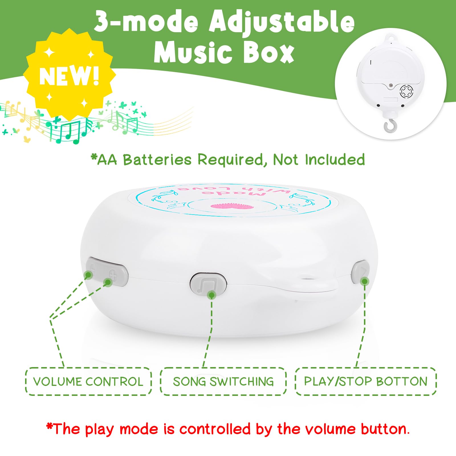 12 Soothing Lullabies: The newly upgraded 3-mode adjustable music box lets you choose between Rotation Only, Music Only, or Both. As the gentle melodies play, the toys slowly spin, creating a calming atmosphere that makes bedtime a smoother and more enjoyable experience for both baby and parents