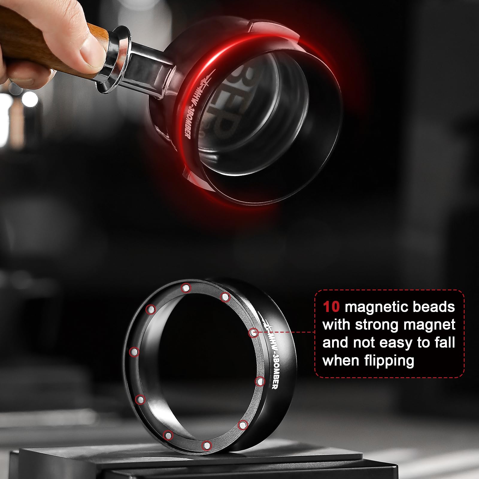 Bottom Hanging Design: Because the magnetic dosing ring is attached to the outer ring of the portafilter basket, it will not occupy the inner wheel of the basket, which can increase the powder connection range, and there is no depression around the back basket after being put away.