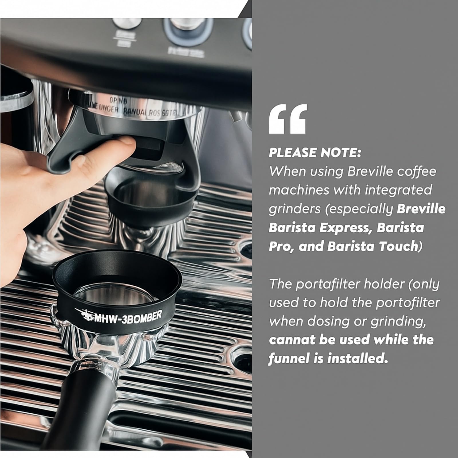 PLEASE NOTE this funnel is not compatible with Breville Barista Express, Barista Pro, and Barista Touch portafilter holder when the funnel is installed. It can be used with an individual grinder instead.