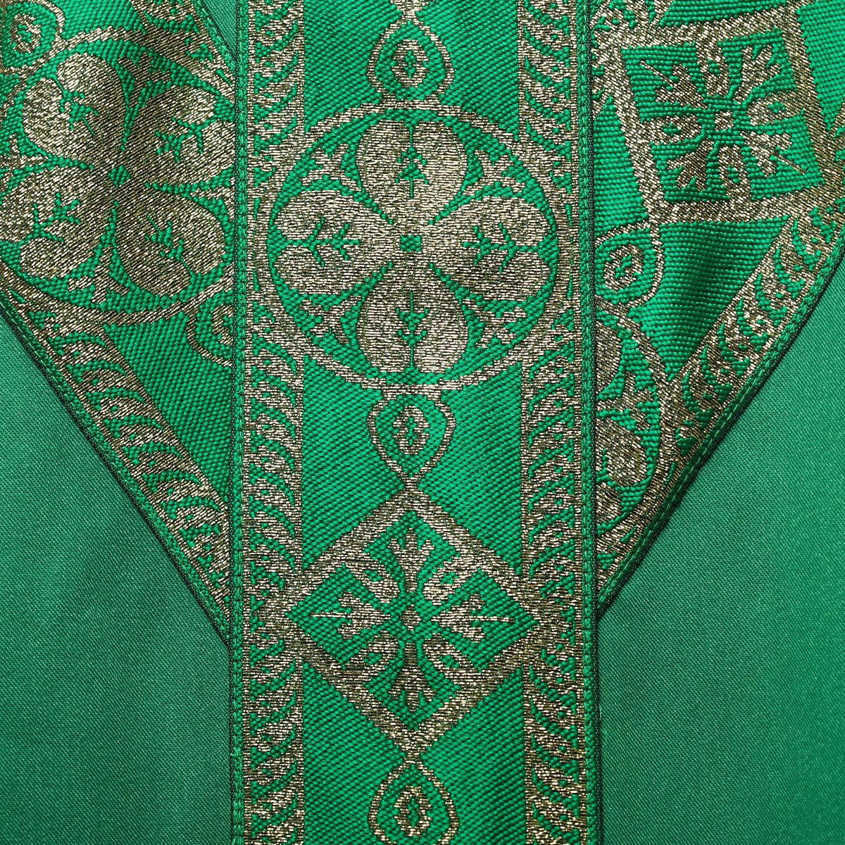The Chasuble has a Y orphrey and a Gothic style plain neck with gold metallic jacquard banding. Inspiration from the French Avignon collection.
