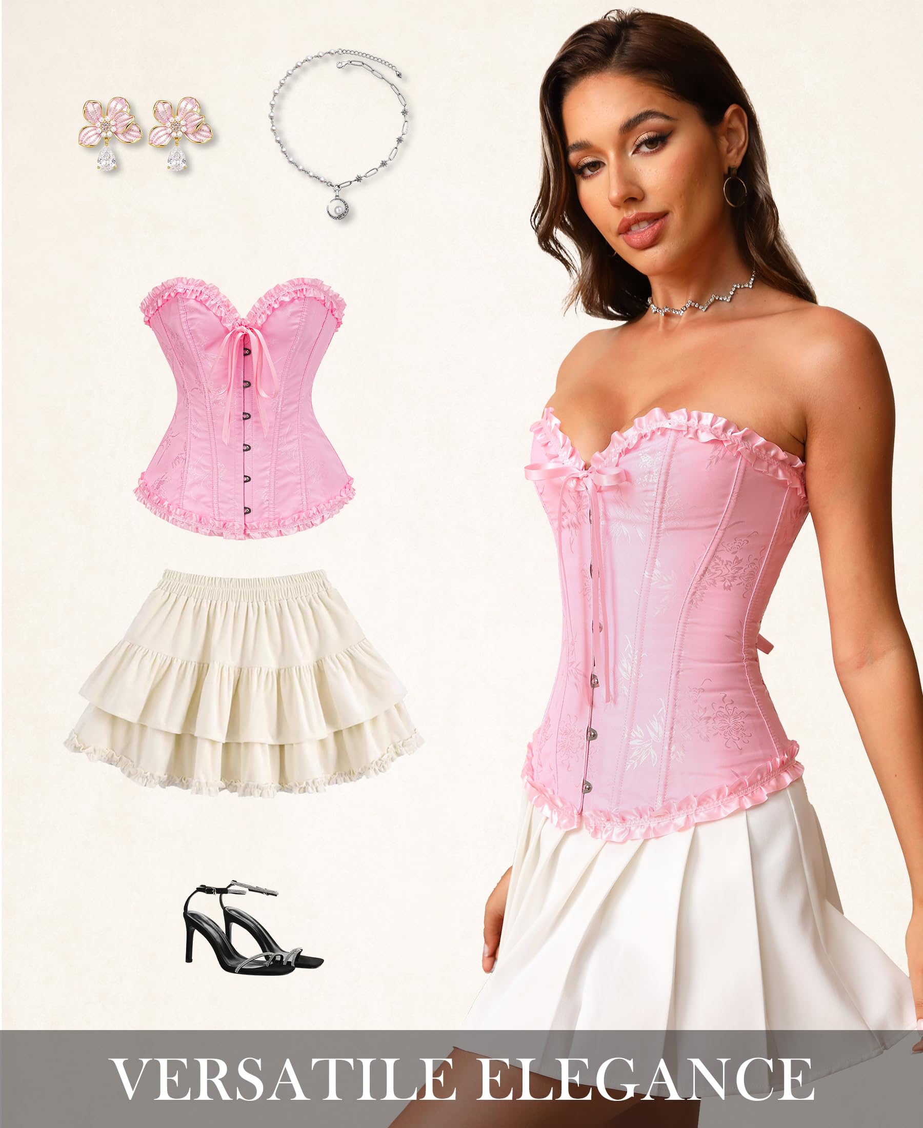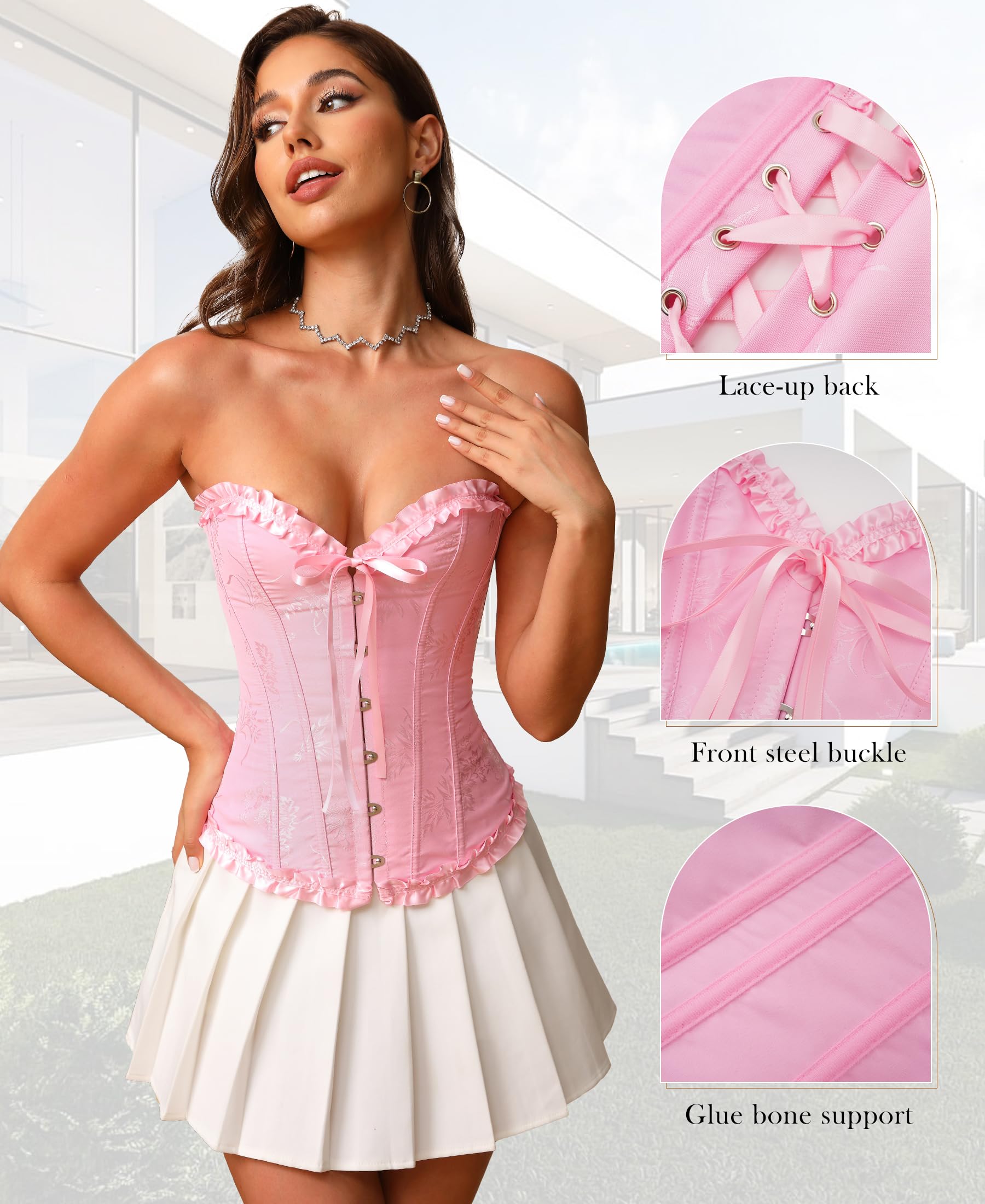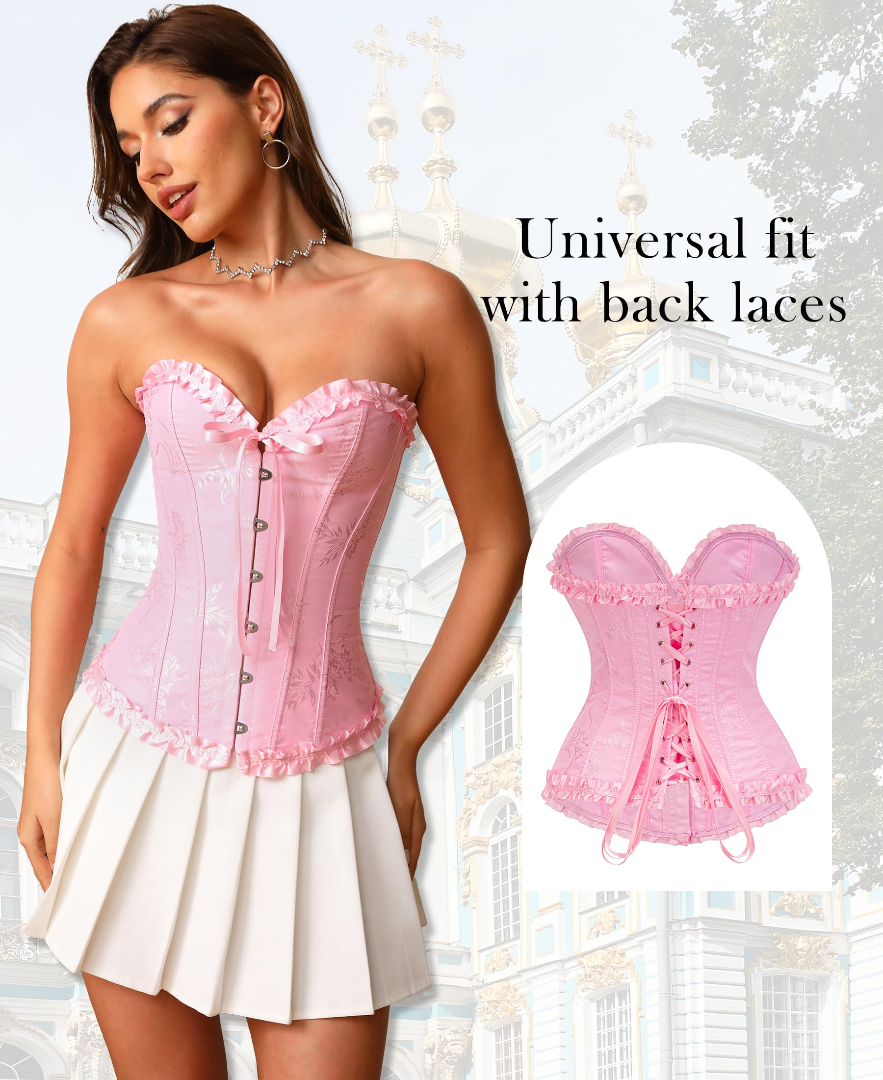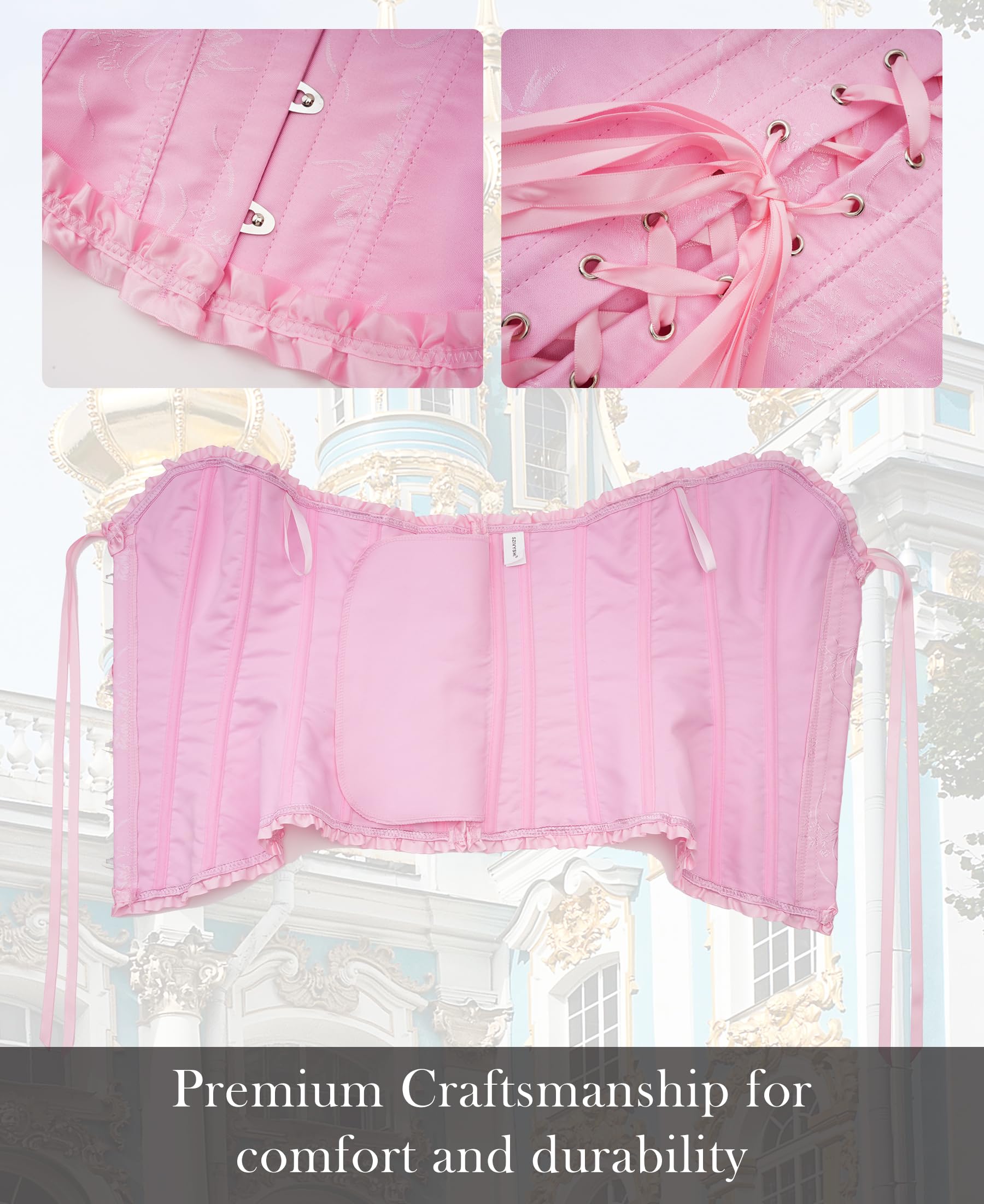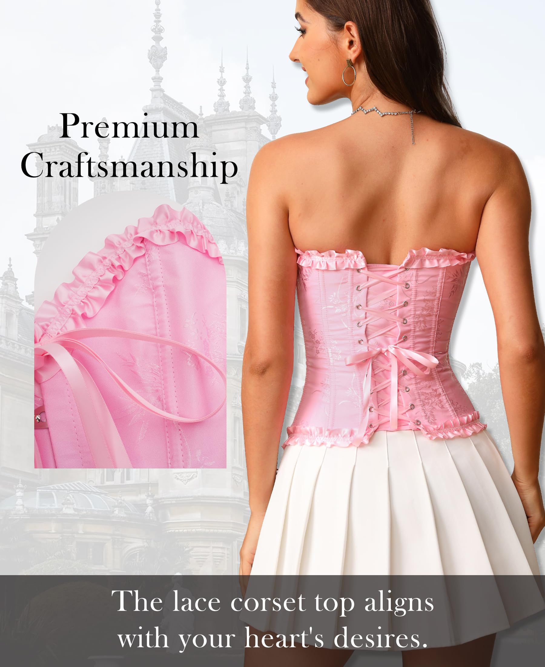 ALL DAY COMFORT: Our overbust corset top is a harmonious blend of comfort and elegance, made with materials that caress your form while ensuring freedom of movement. The waist corset unique 12 plastic bone structure is engineered to support an upright posture, reducing back strain. Designed for wearability from dawn until dusk, the waist cincher corset is the ideal everyday companion. Our lace corset top aligns with your body's needs and your heart's desires.