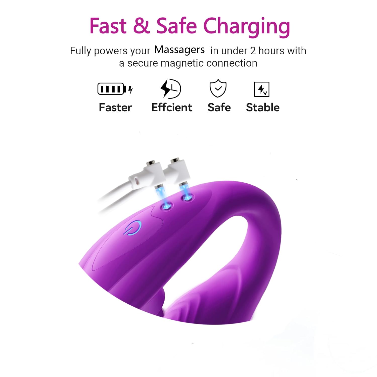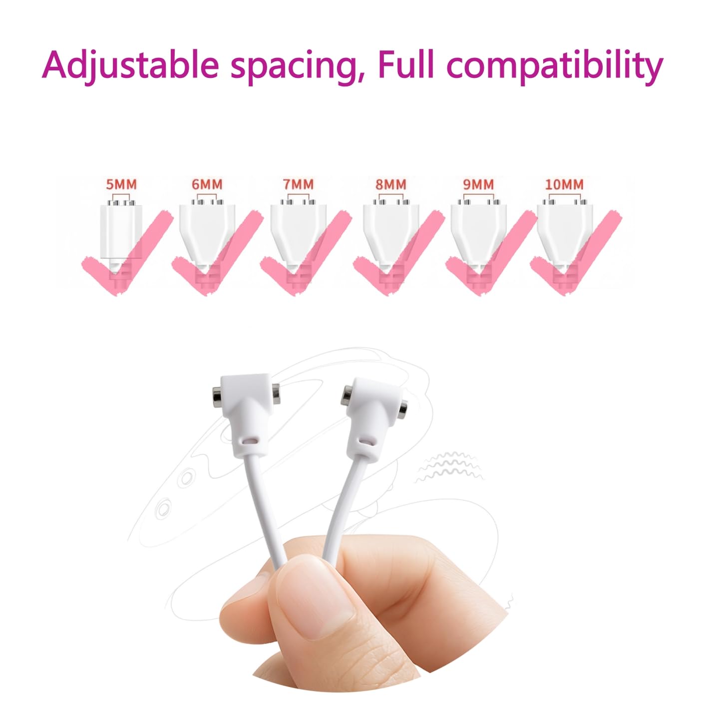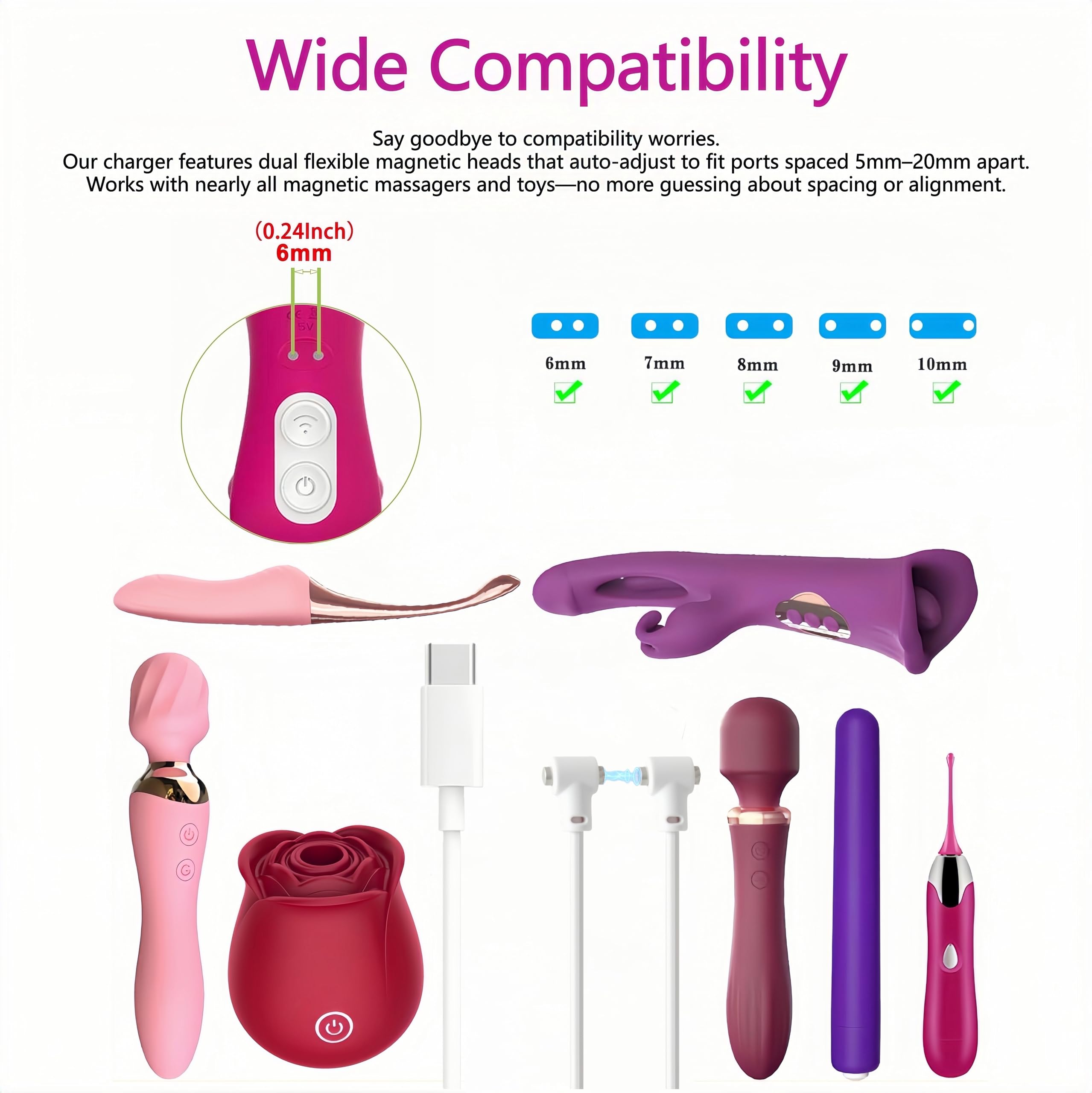 【Wide Compatibility】 Say goodbye to compatibility issues. Our charger features two separate, flexible magnetic heads that automatically adjust to fit charging ports spaced from 5mm 6mm 7mm 8mm 9mm 10mm 12mm to 20mm apart. It works with nearly all magnetic rechargeable massagers and toys, eliminating the need to worry about head distance and magnetic issues separately for your magnetic devices.