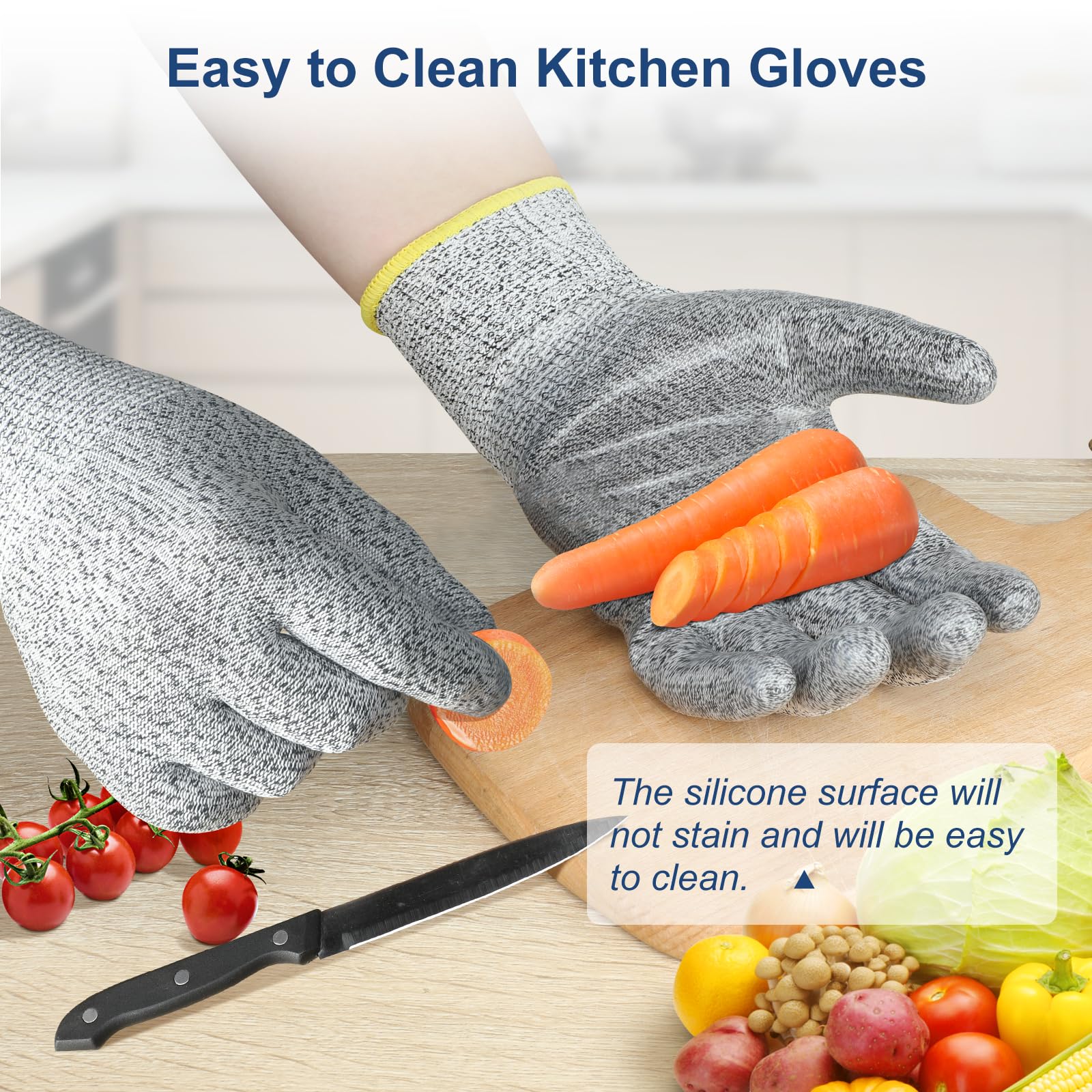 [100% Food Grade, Use with Confidence] Crafted from food-grade materials, these cut-resistant gloves offer peace of mind in the kitchen. Whether you're a passionate home cook, a professional chef, or a skilled butcher, these gloves are your perfect companion when using mandolines, knives, or any other cutting tools. The transparent silicone coating prevents staining of your food or wood carvings, making them ideal for both kitchen and wood carving applications.