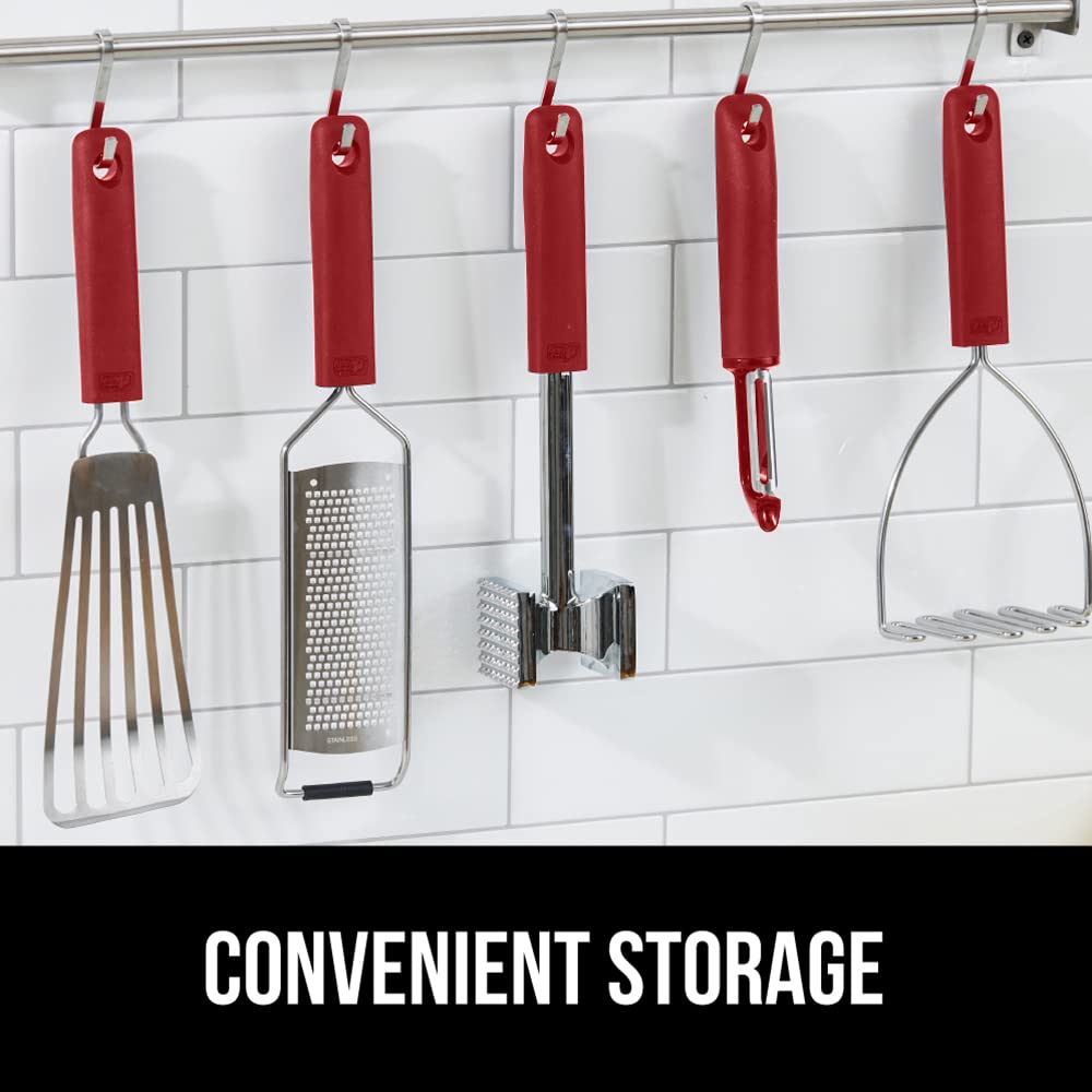 PATENTED ERGONOMIC, SLIP RESISTANT HANDLE: featuring an ergonomic, soft touch rubber handle, peeling has never been more comfortable; our unique slip resistant handle helps you keep a firm grip; oversized design measures nearly 8 inches, making the vegetable peeler an ideal size for even the toughest produce
