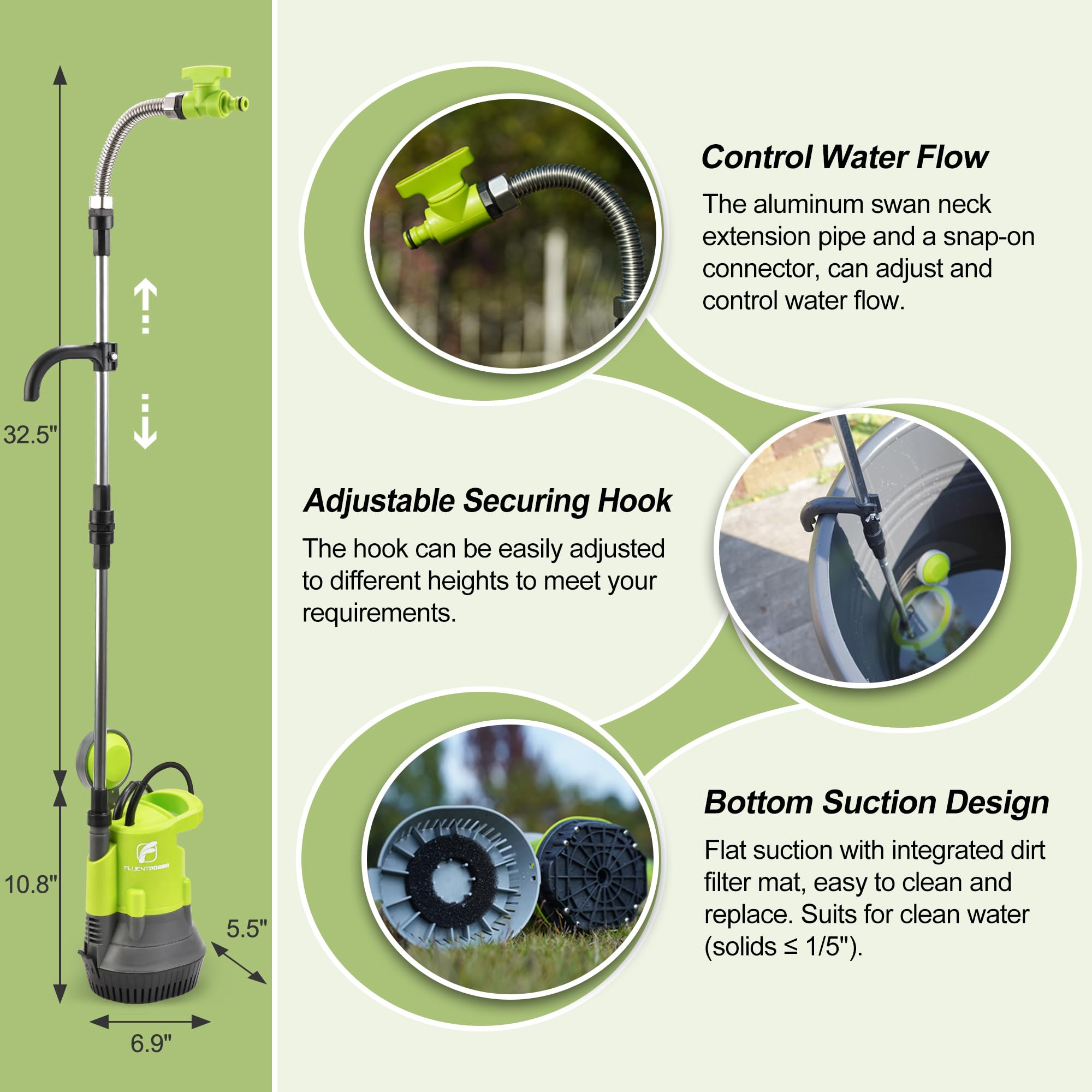 EASY TO USE & INSTALL: Comes with two aluminum extension tubes, an adjustable securing hook and a spray nozzle with flow control. Fits all standard garden hose connector systems. Adjustable telescopic tube for adjustment to the height of the rain barrel, and 26 ft cable and approved plug for wide range of use.