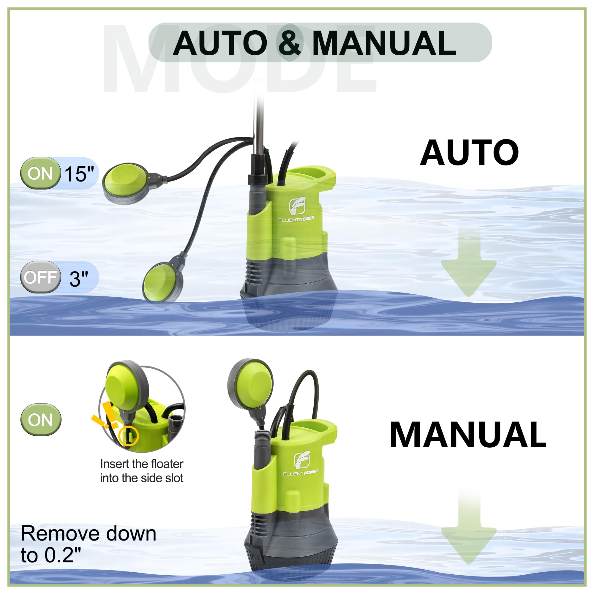MANUAL OPERATION: If the water level is not high enough to start with auto mode or you want to remove water as lower as possible (0.2"), you can switch to manual control. Pump will keep continuously running and will not turn off automatically, so remember to cut off the power immediately to prevent the motor becoming burned.