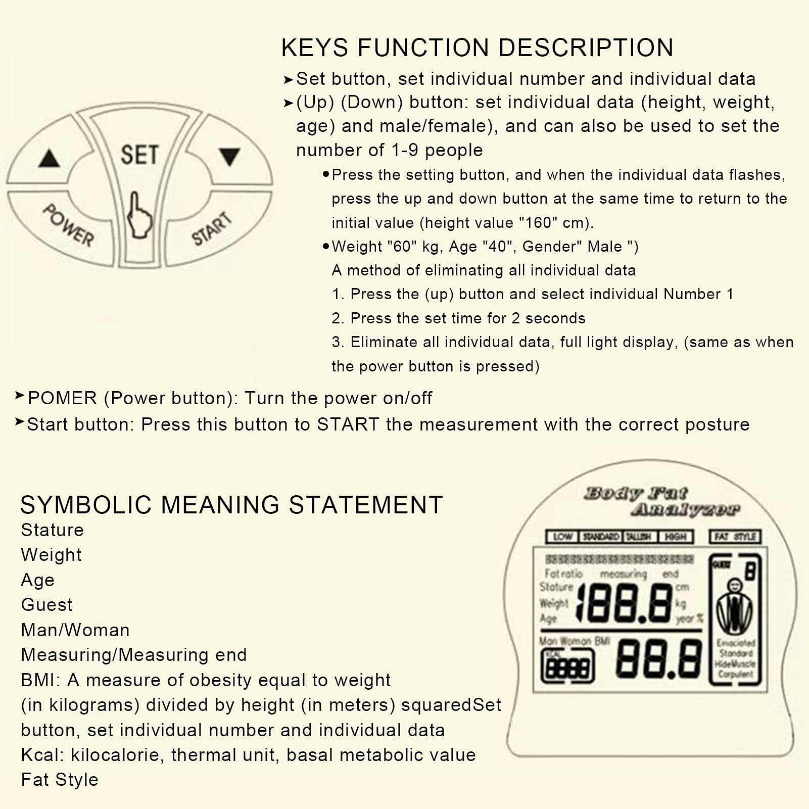 Specification: Item Type: Body Fat Measuring Instrument Material: ABS Color: Silver Battery: 2pcs AAA (Not included) Package List: 1 x Fat Analyzer 1 x Manual Usage: 1. After installing the battery or pressing POWER, LCD will display in full screen, and the buzzer will be heard and enter the setting state; 2. Press SET to enter Height Setting - Weight Setting - Age Setting - Sexual Setting;The setting process can be adjusted to the desired setting according to ▲/ ▼, in which the guest number and age are increased or decreased by 1 unit each time, the height is increased or decreased by 0.5cm, the weight is increased or decreased by 0.2kg, and the gender is converted between men and women;Hold ▲/ ▼ for 2 seconds to enter the fast tuning state; 3. After setting the data, press START, and hold the handle with both hands to measure the corresponding fat rate, basal metabolic value and BMI value; 4. The test results show the body fat percentage and body type, which can be divided into Emaciated, Standard and Concealing Corpulent., Muscle Corpulent and Corpulent; 5. Measurement results such as E1 may be caused by too dry hands during the test, E2 may be caused by not holding hands well, and E3 is the range tested by the body fat machine. 6. If the test is stopped for more than 2 minutes, the system will automatically shut down;Please press POWER to answer again. 7. Valid value range for data: Height range: 100-199.5cm Weight range: 10-199.8kg Age range: 10-99year The number of groups ranged from 1 to 9groups Note: Please note that the new type and old type of this product will be sent randomly, and make sure you will not mind before ordering.