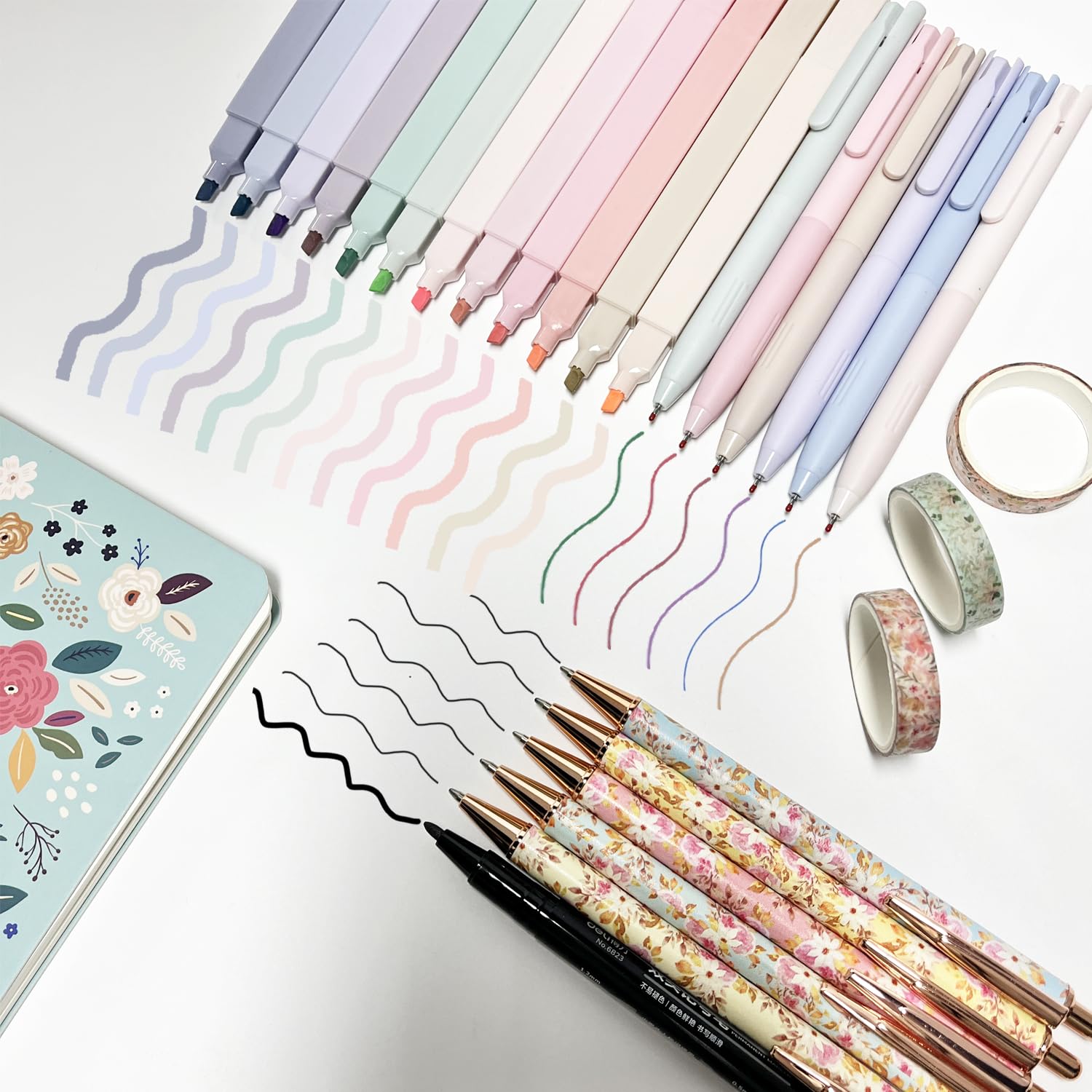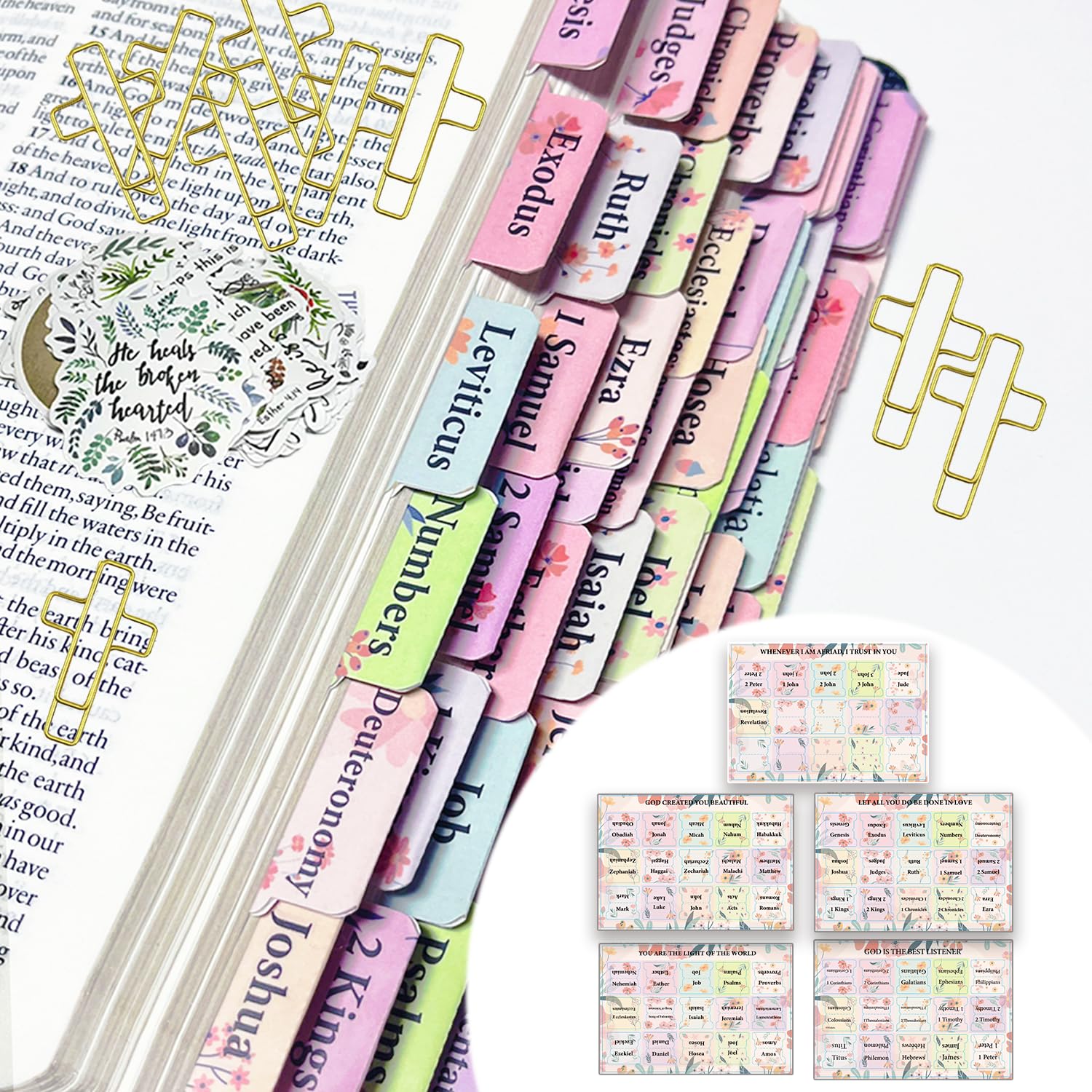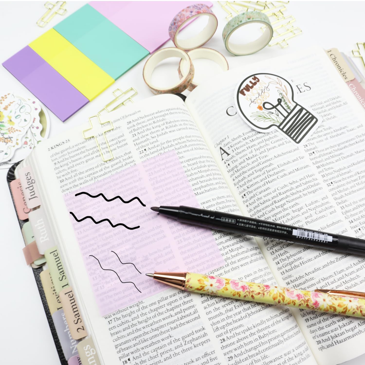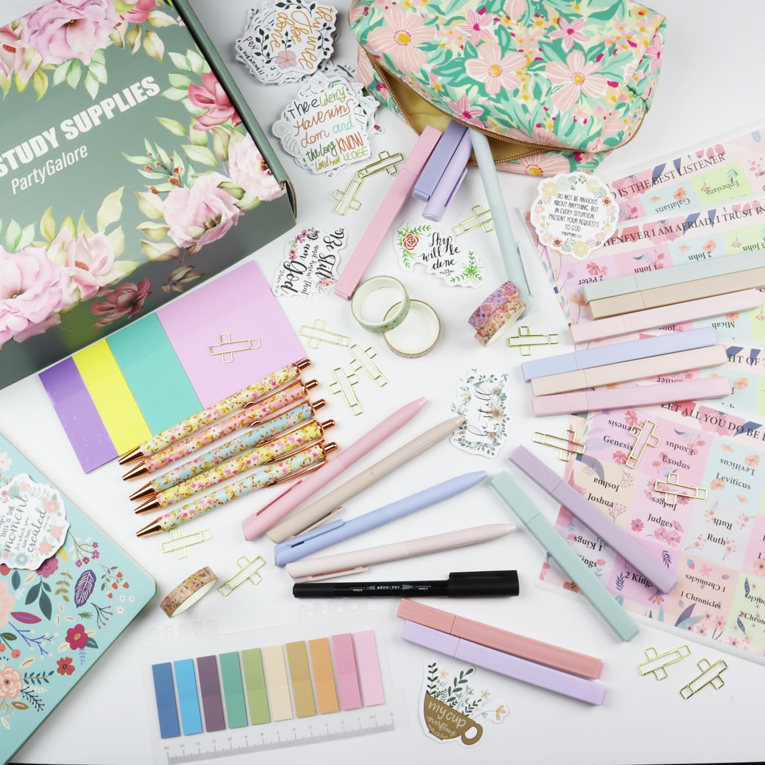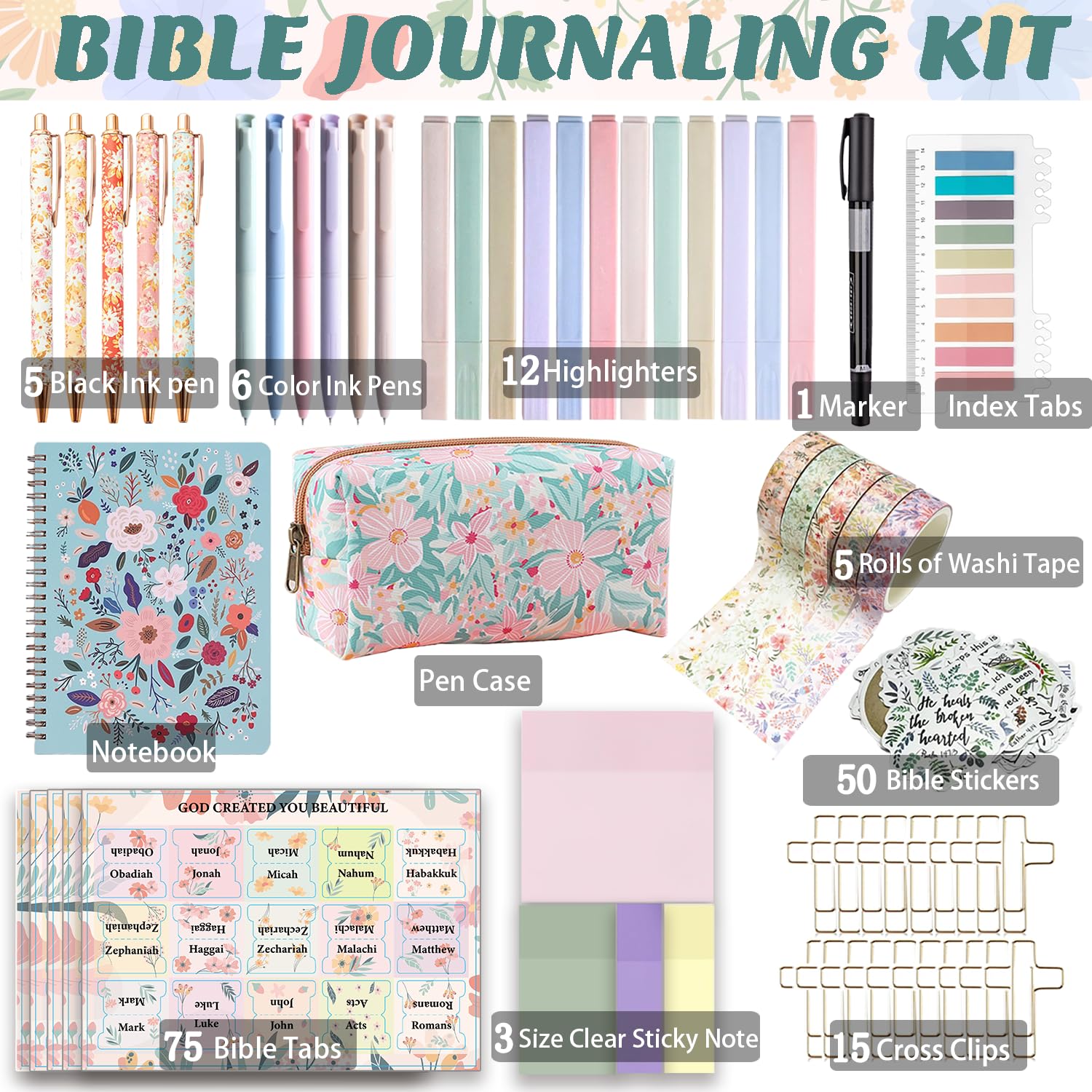 ALL-IN-ONE BIBLE STUDY KIT: Includes 66 Bible Tabs and 9 personalized blank Tabs, 15 Paper Clipers, 12 Highlighters, 5 black ink pens and 6 multi-color ink pens, 4-color and sizes semi-transparent sticky notes and index tabs (with 1 marker), bible notebook, pen case, scripture stickers, 5 rolls of washi tape and more
